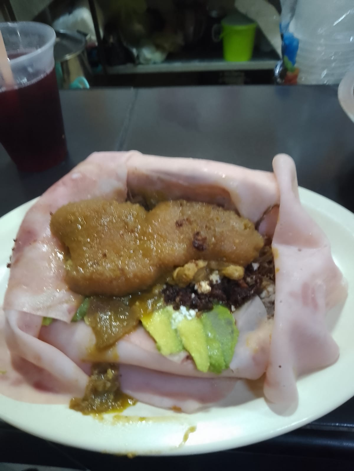 Carne de cerdo, cebolla, cilantro, rábano, crema, aguacate, agua horchata o Jamaica.