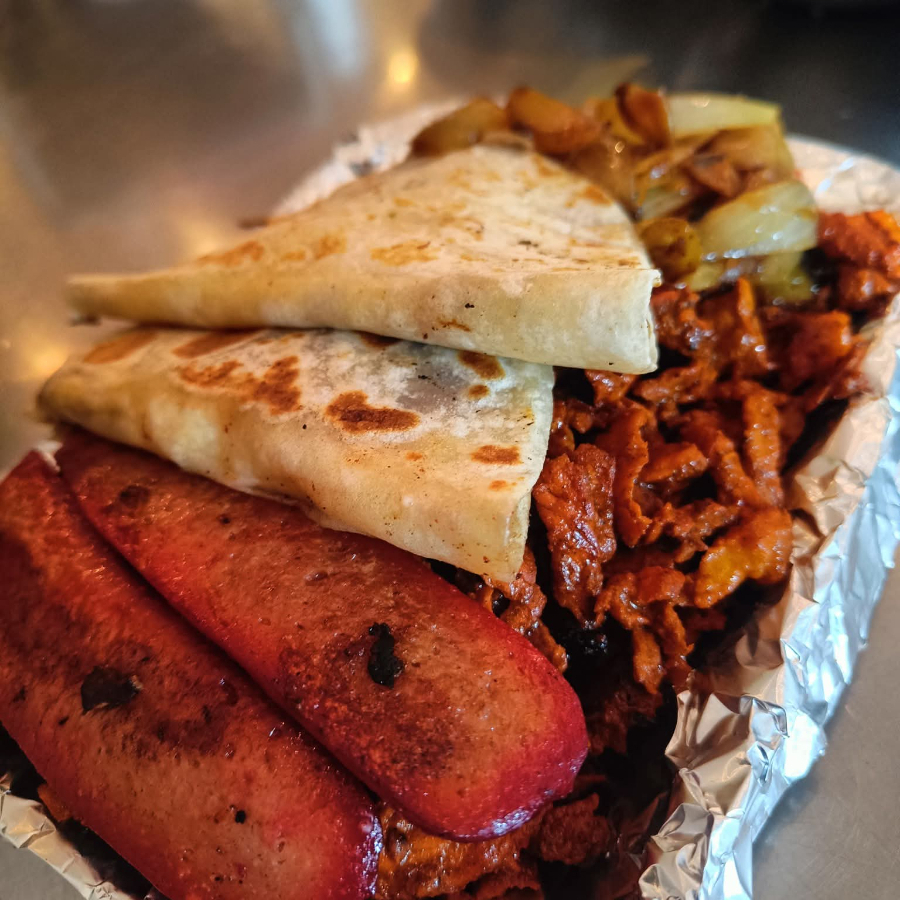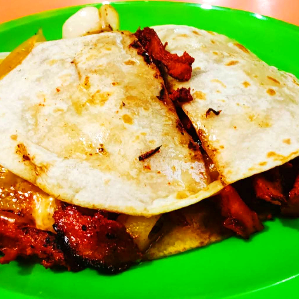 Carne Al Pastor Envuelta En Dos Tortillas De Harina Con Jugosa Piña Y Queso Asadero.