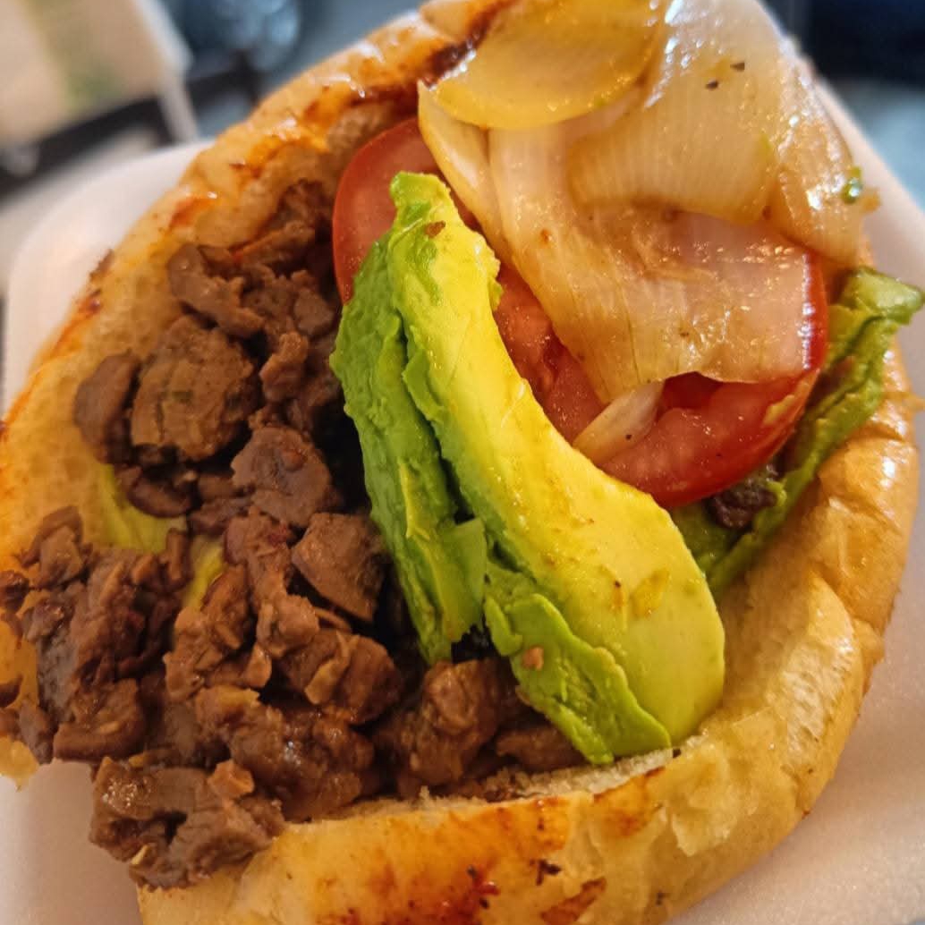 Torta En Pan Francés De Arrachera Con Lechuga, Tomate, Cebolla Cocida, Aguacate, Queso Asadero
