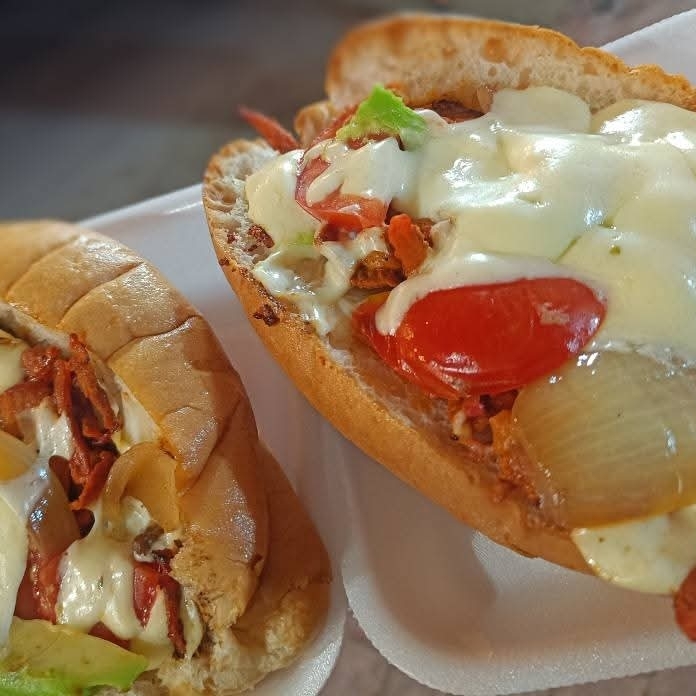 Torta En Pan Francés De Pastor Con Lechuga, Tomate, Cebolla Cocida, Aguacate, Queso Asadero.