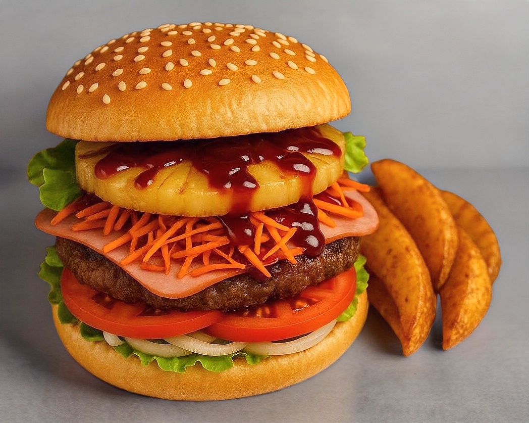 2 Hamburguesas , carne de res casera ,Piña, Jamón, Aderezos: mayonesa, mostaza, bbq, catsup. Lechuga,Tomate, cebolla. Incluye porcion de papas fritas y salsa verde cremosa.