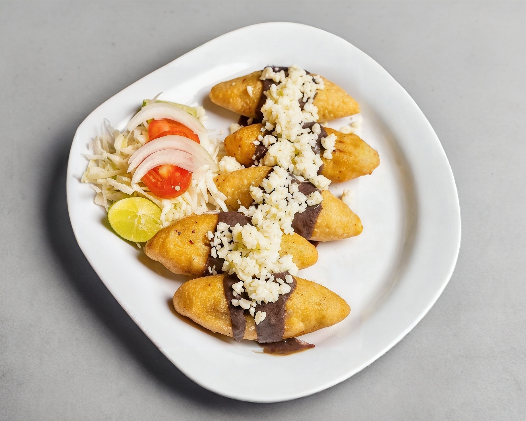 Orden de 5 piezas, rellenos de puré de papa, queso y carne deshebrada de res, con ensalada, frijoles, y salsa picante.