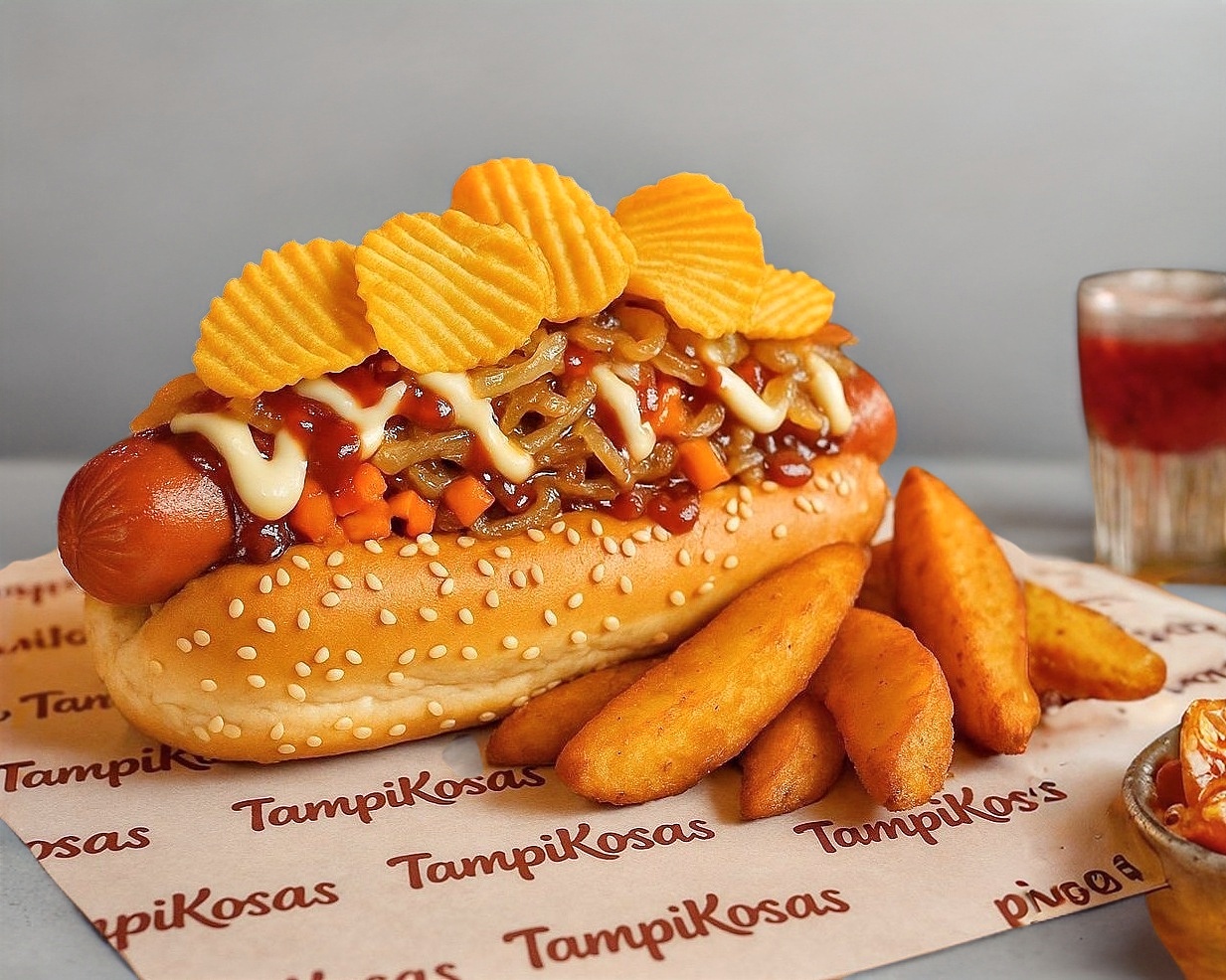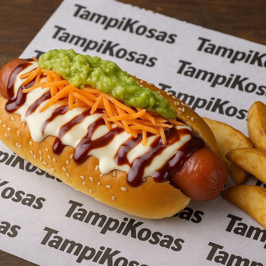 Al estilo sinaloa. Pan casero, salchicha jumbo, queso asadero gratinado en cebollitas asadas, tomate, aderezos: mayonesa, mostaza, bbq, papas fritas y un topping de Chettos Flamin Hot y salsa verde cremosa.