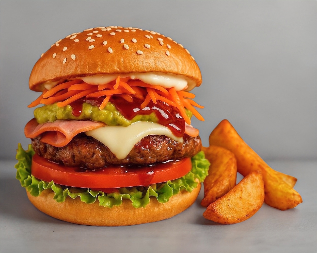 Con carne de res casero, Guacamole, queso asadero derretido, lechuga, tomate, cebolla, aderezos: mayonesa, bbq, mostaza, acompañada de papas gajo y salsa cremosa picante.