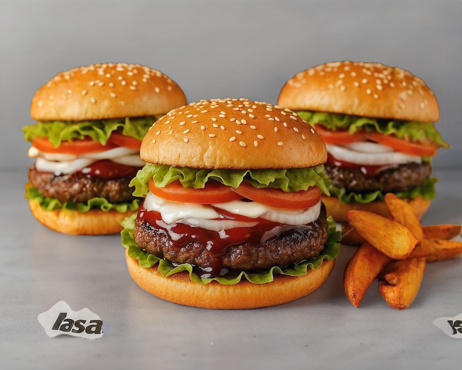 3 Hamburguesas , carne de res casera , Jamón, Aderezos: mayonesa, mostaza, bbq, catsup. Lechuga,Tomate, cebolla. Incluye porcion de papas fritas y salsa verde cremosa.