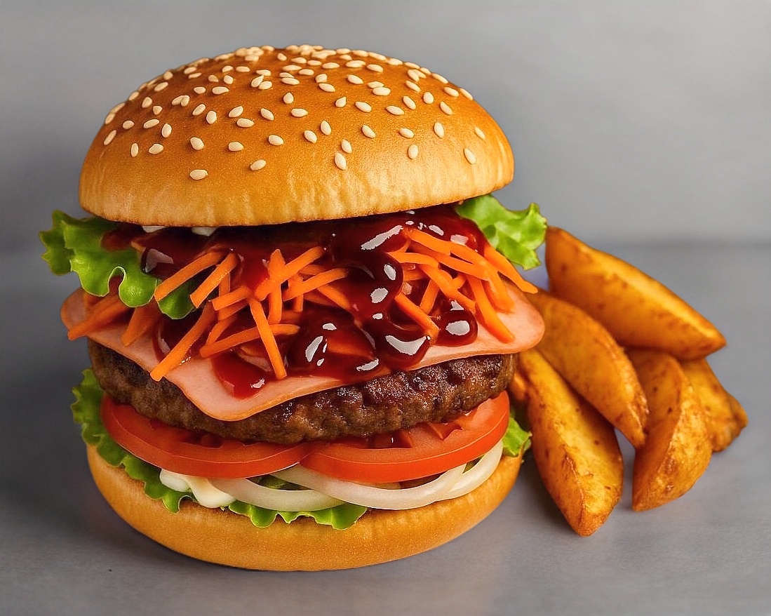 Con carne de res casera, jamon, lechuga, tomate, cebolla, Aderezos: mayonesa, mostaza, bbq, catsup, acompañada con una porcion de papas fritas y salsa picante cremosa .