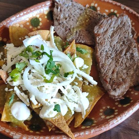 Totopos caseros bañados en nuestra deliciosa salsa roja o verde, queso, crema, frijoles y cebolla, acompañados de bistec de res.