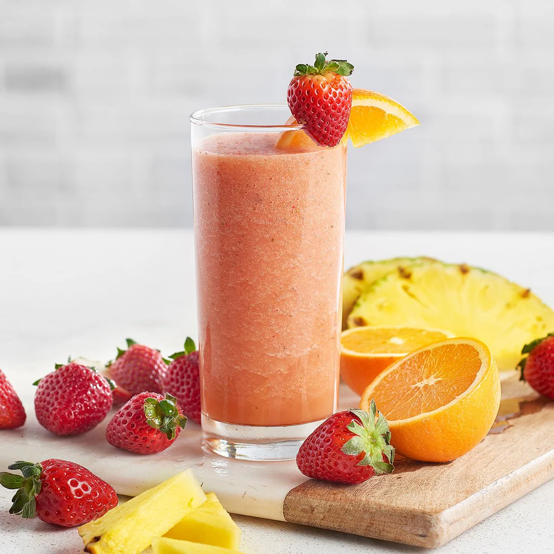 Una mezcla vibrante de naranja, fresa y piña. El balance perfecto entre lo cítrico y lo dulce, pura energía tropical para salvar tu día.