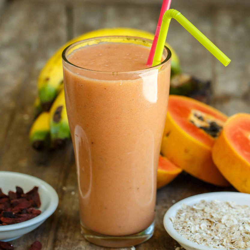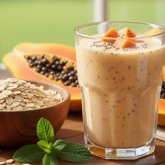 Batido nutritivo de papaya y avena, perfeccionado con un toque de esencia de vainilla que resalta su sabor sutil y reconfortante.