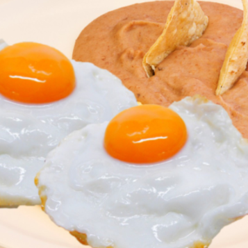 Elige dos huevos preparados a tu estilo: revueltos, estrellados o tiernitos (estrellados volteados). Todos se sirven con una porción de nuestros clásicos frijolitos refritos y tortillas de maíz.