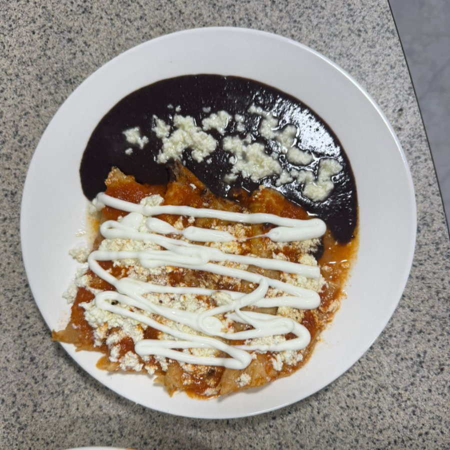 Cuatro tortillas de maíz bañadas en nuestra salsa de tomate casera, coronadas con queso fresco y un toque de crema. Servidas en compañía de frijoles refritos.