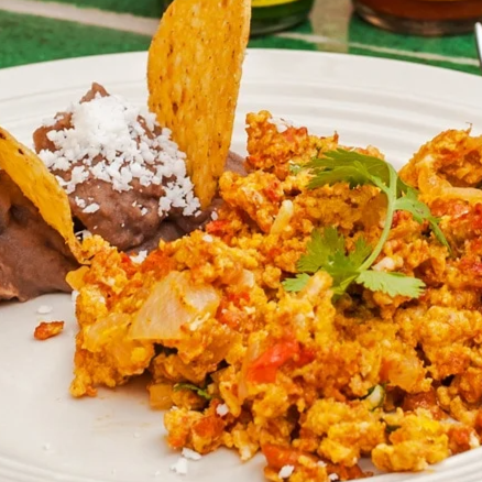 Huevos con tomate, cebolla y el toque justo de chile verde. Servidos con frijolitos refritos de la casa y tortillas de maíz. El sabor casero directo a tu mesa.