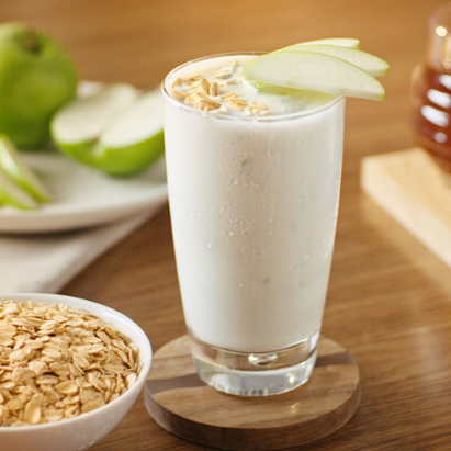 Licuado de manzana fresca con avena, caracterizado por un toque casero y una textura tersa que resalta el dulzor de la fruta.