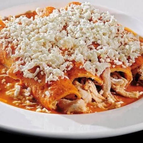 Entomatadas (4 piezas) con queso y crema, acompañadas por una ración de pollo deshebrado y frijoles refritos.