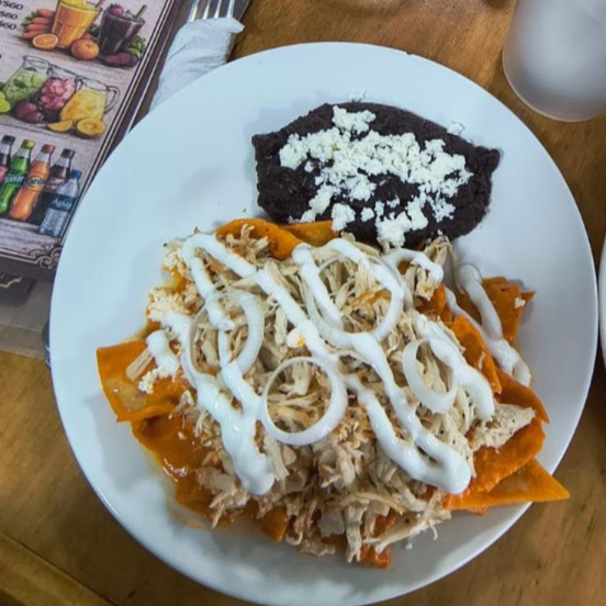 Totopos caseros bañados en nuestra deliciosa salsa roja o verde, queso, crema, frijoles y cebolla, acompañados de pollo.