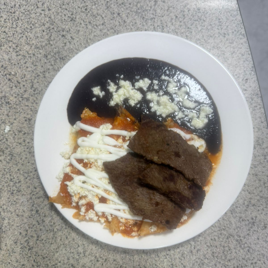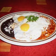 Orden de 4 tortillas de maíz sumergidas en nuestra salsa de tomate, realzadas con queso fresco y crema. Complementadas con bistec de res y una porción de frijoles de la casa.