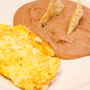 Delicioso omelette relleno de trocitos de tocino crujiente y una generosa capa de queso derretido. Acompañado de frijoles refritos y tortillas de maíz