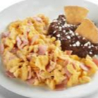 Huevos revueltos con abundantes trocitos de jamón doradito. Servidos con nuestros clásicos frijoles refritos y tortillas de maíz.