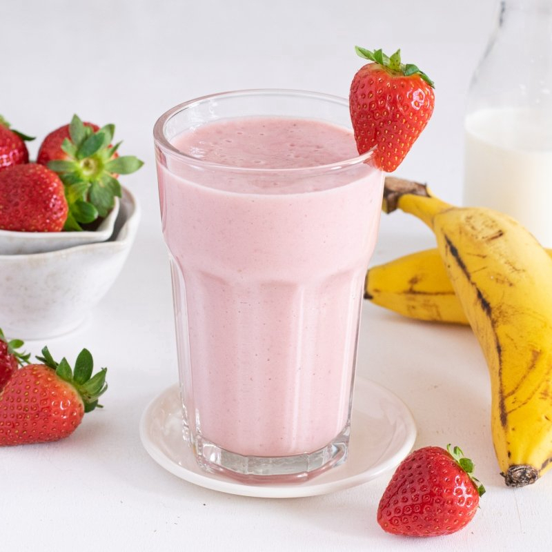 Mezcla clásica de plátano fresco y fresas, caracterizada por una consistencia suave que permite disfrutar la esencia pura de la fruta.