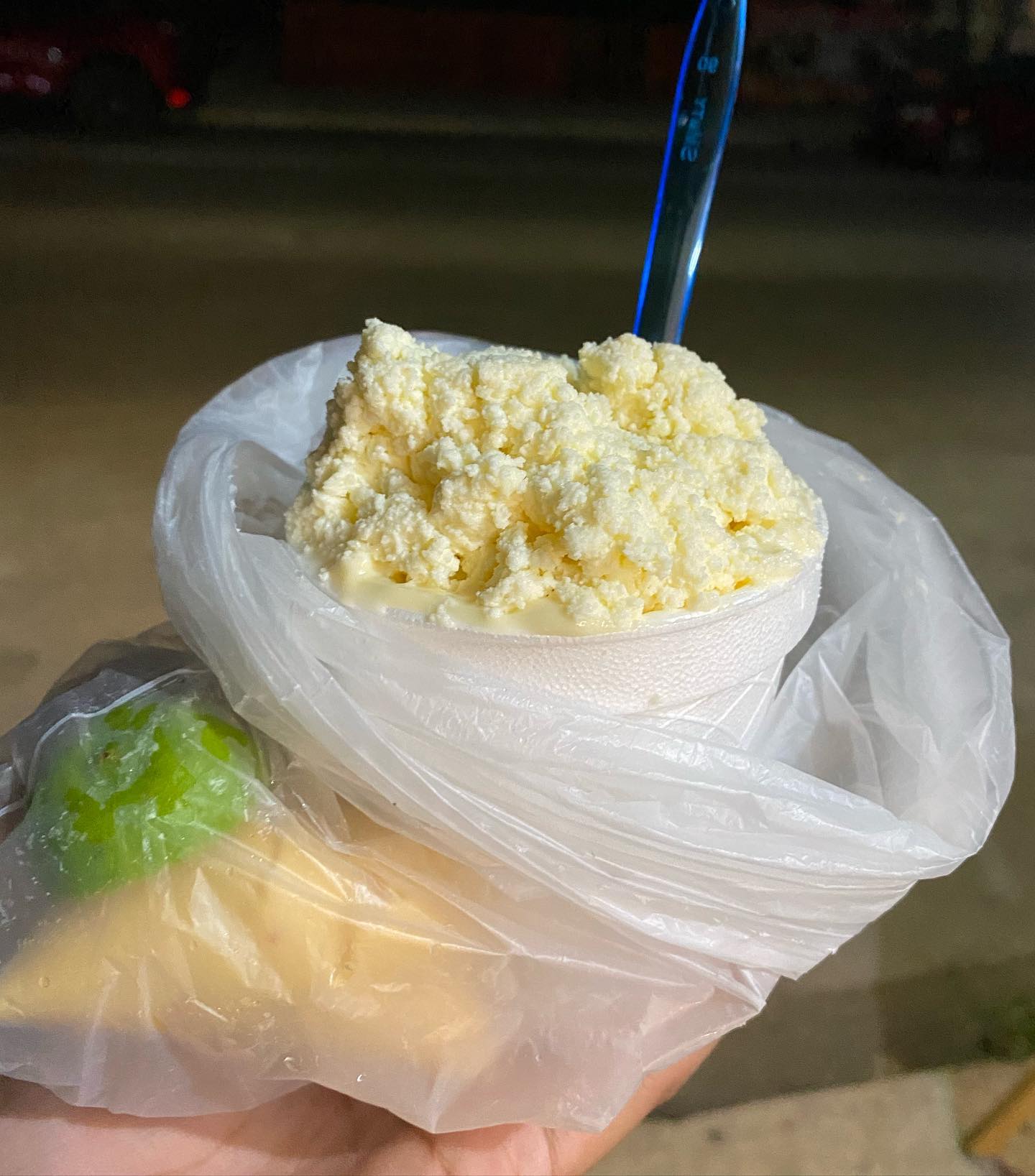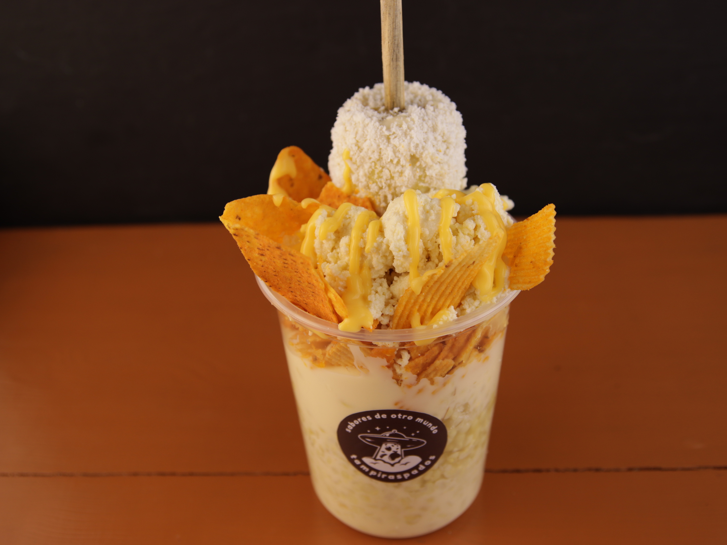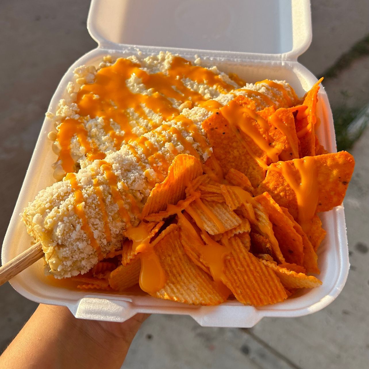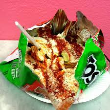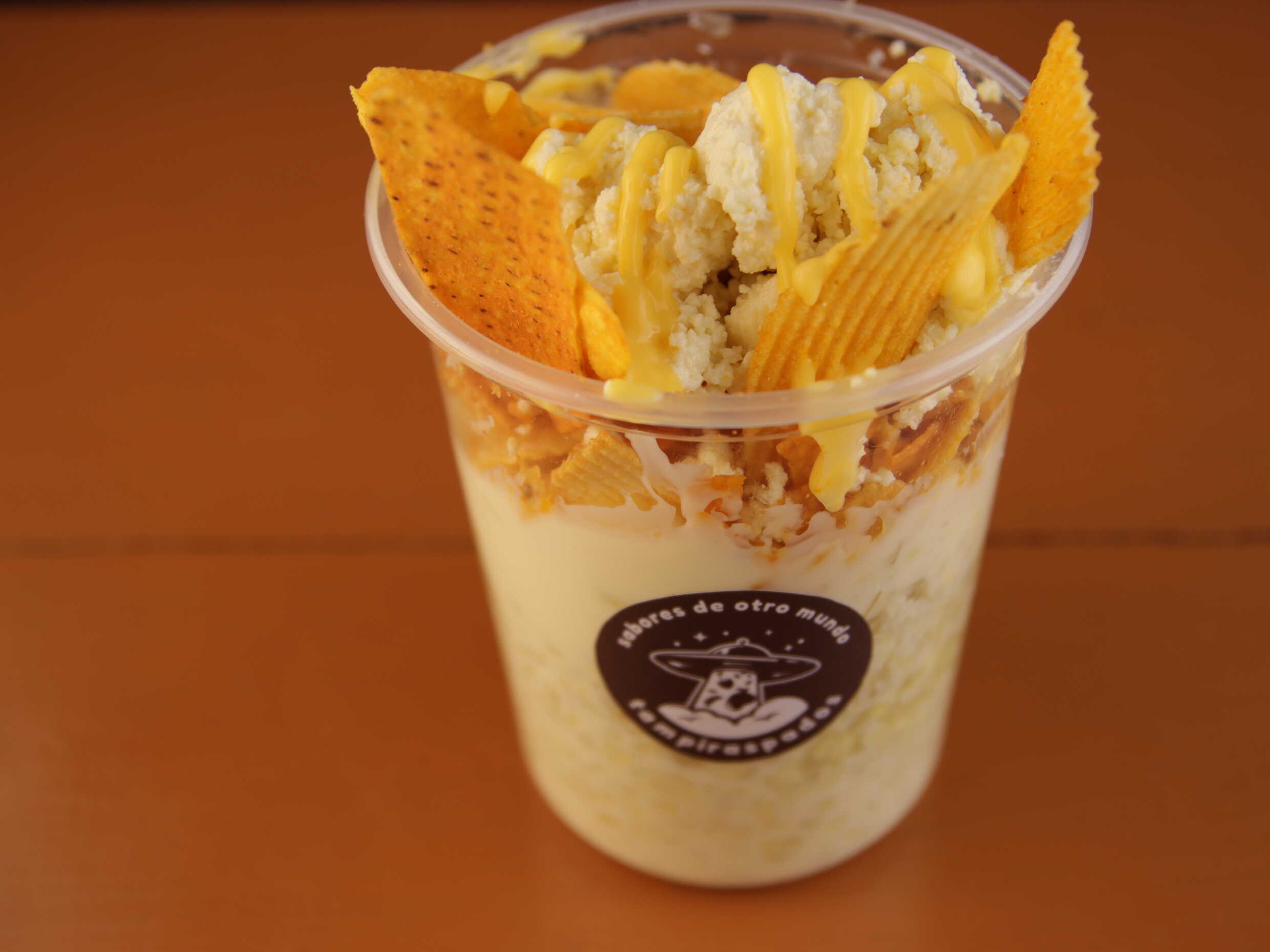 Vaso de litro con mitad de troletote caliente, sabritas y elote con queso amarillo, aderezo de chipotle, salsa de limón y cacahuate.