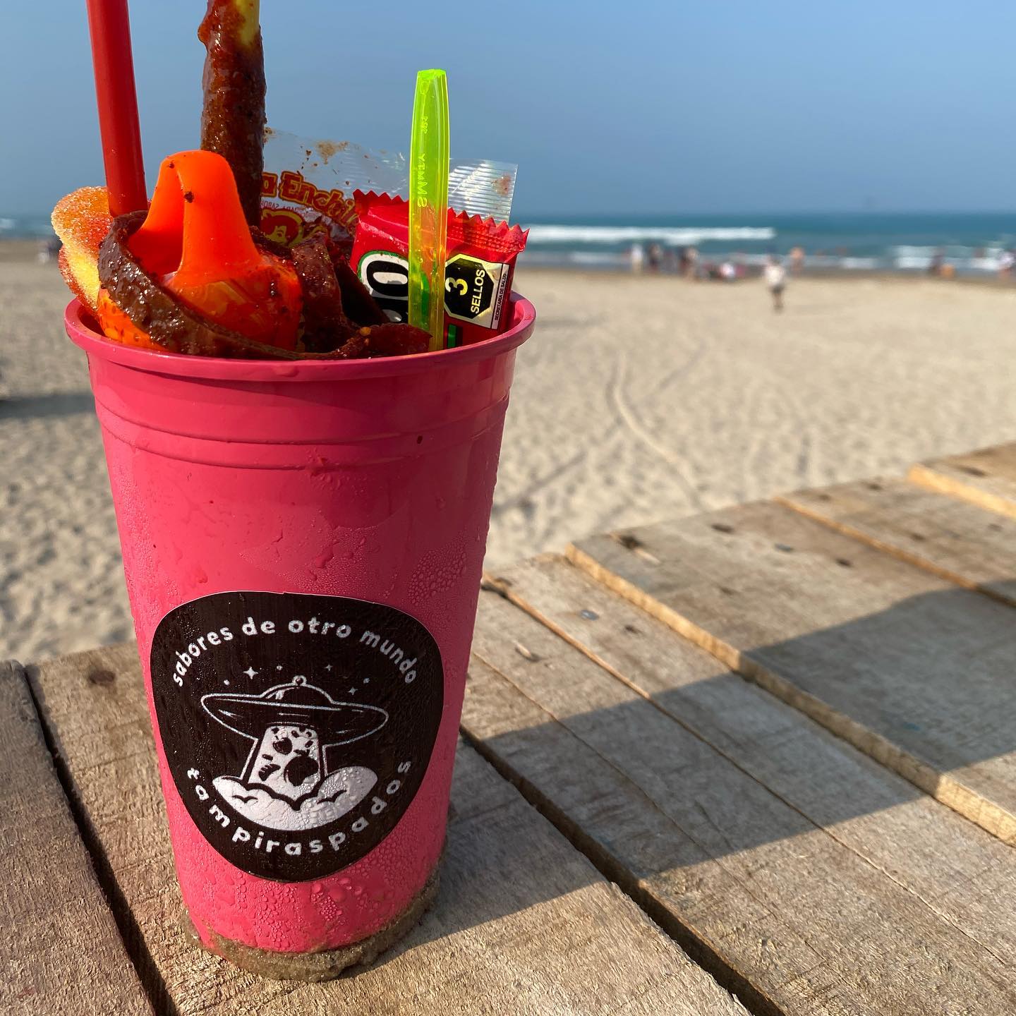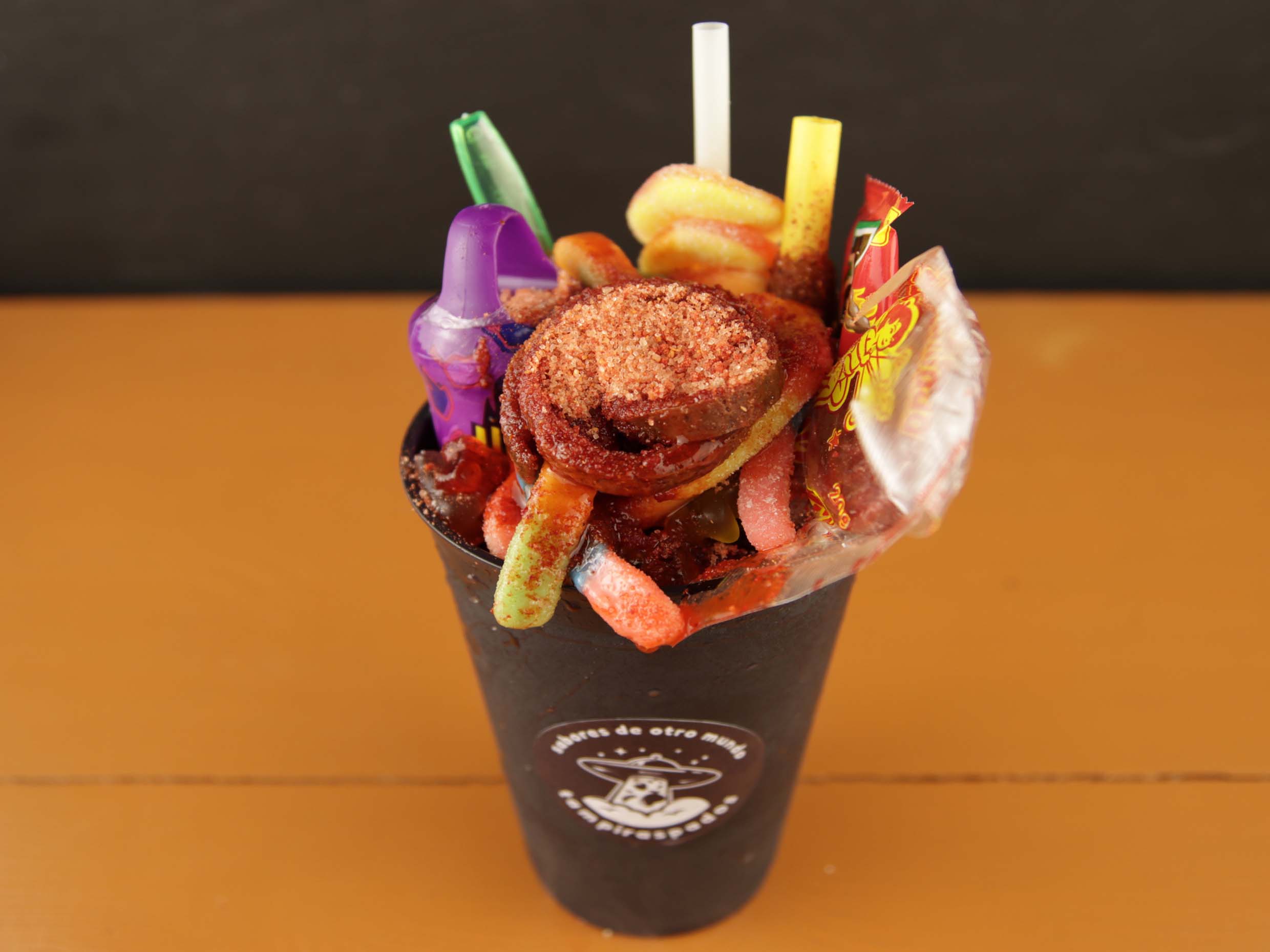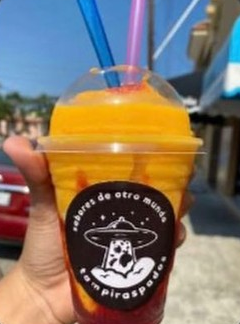 Frappeado sabor picafresa con aros de gomita y pancita de chile.