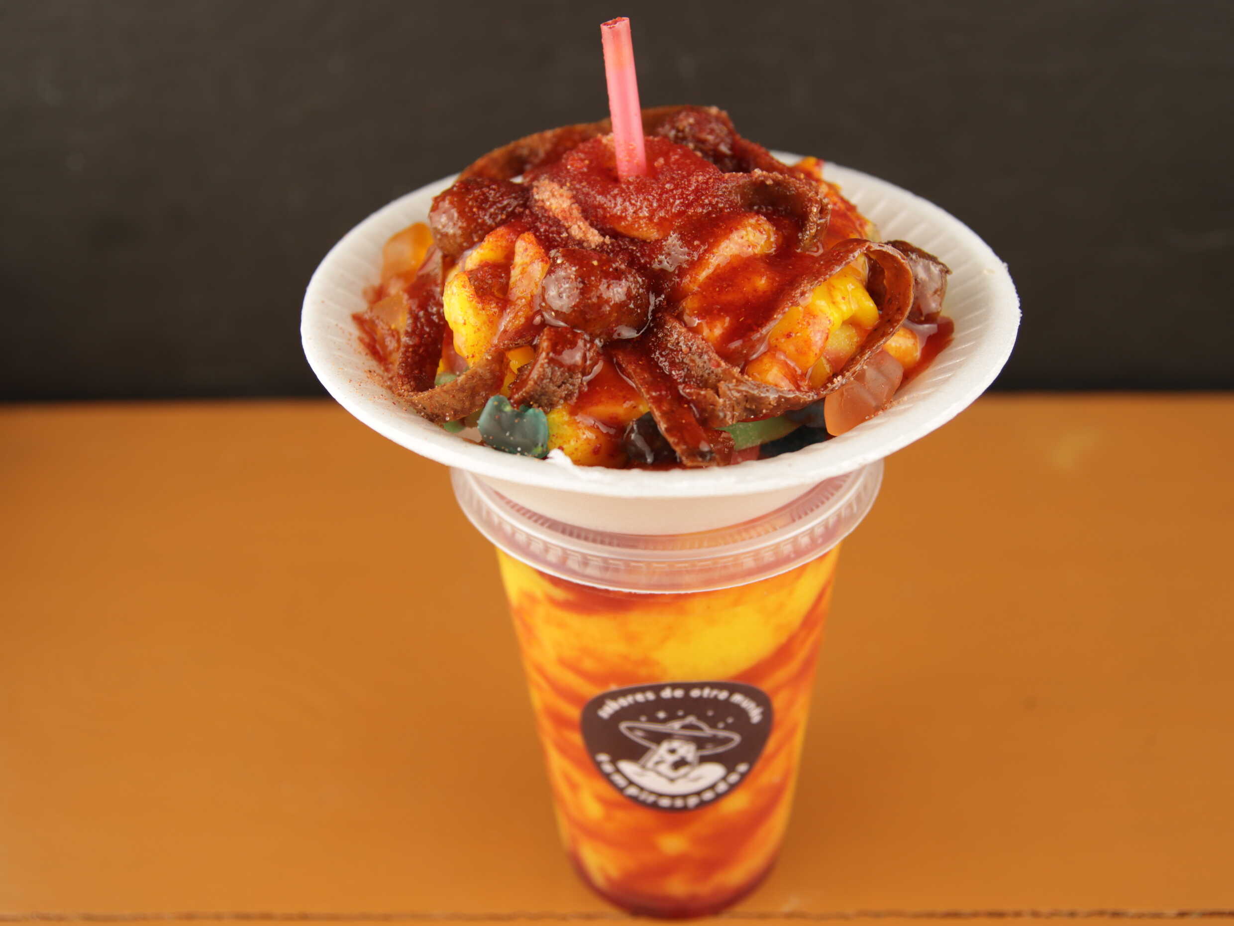 Smoothie de mango con gomitas con chamoy y miguelito.