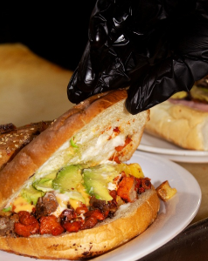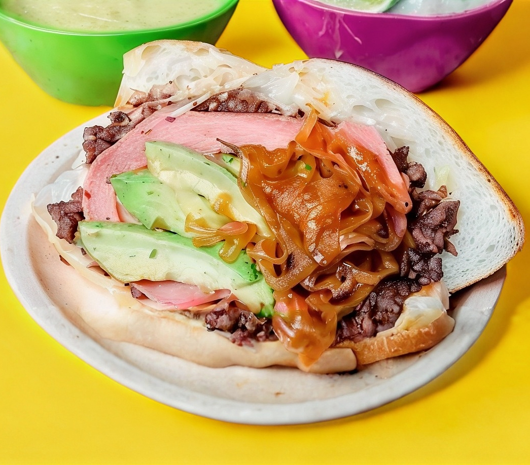 Deliciosa torta mixta de carne de fajita y al pastor con jamón, aguacate, cebollita asada y salsa de la casa.