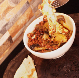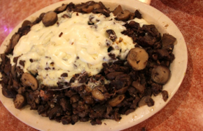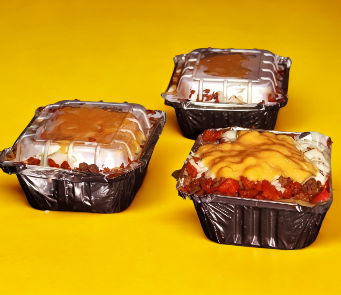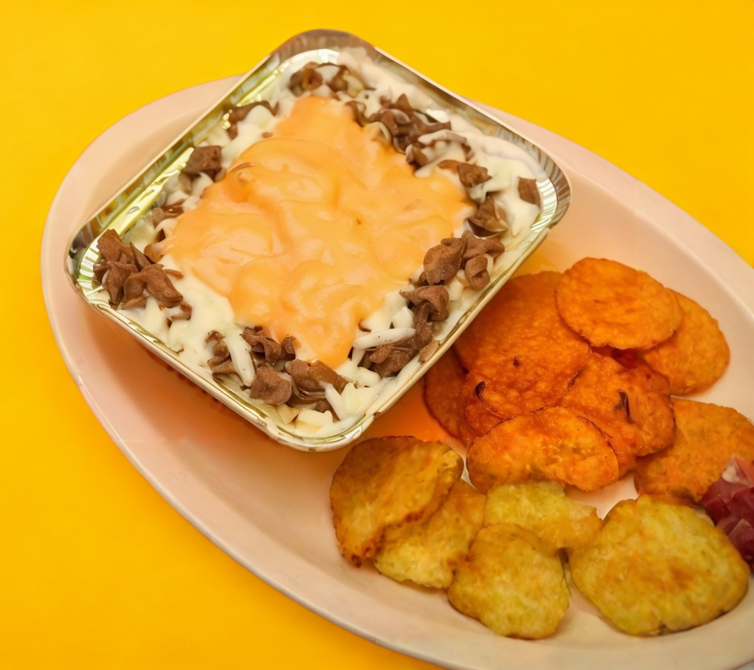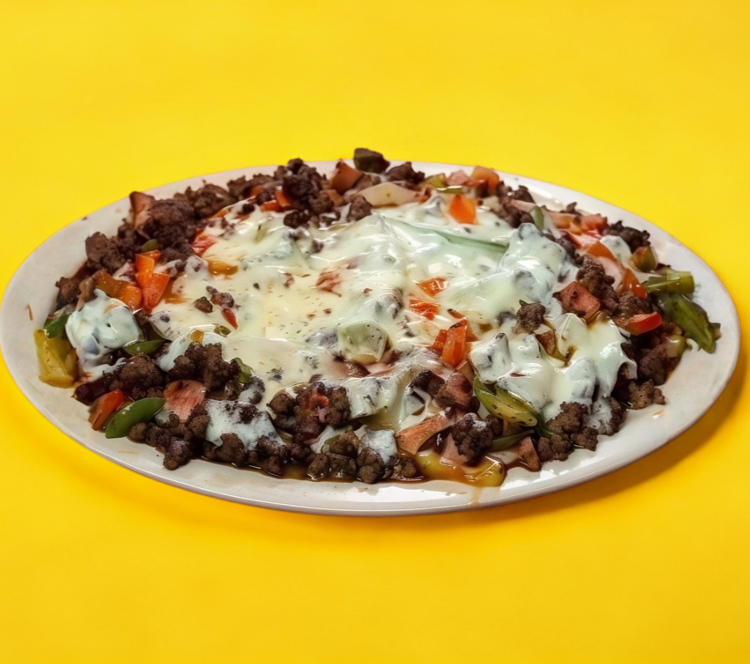 Papa asada con mantequilla, combinación de quesos amarillo, cheedar y porción generosa de carne de fajita y al pastor.