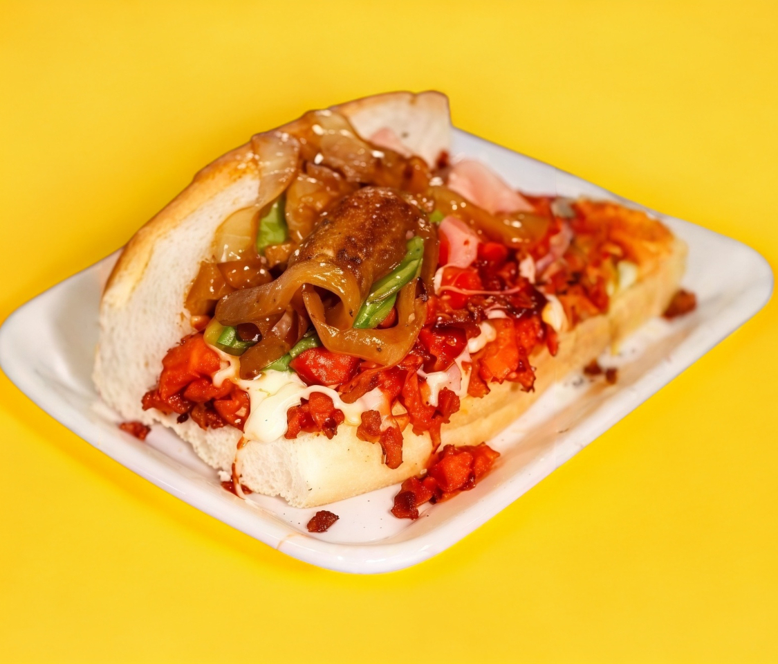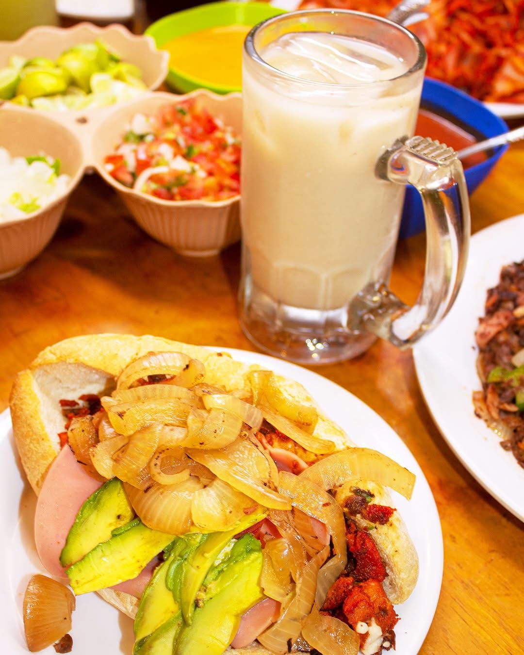 Deleita la torta de pastor con queso, jamón, cebollita asada, aguacate y salsa de la casa.