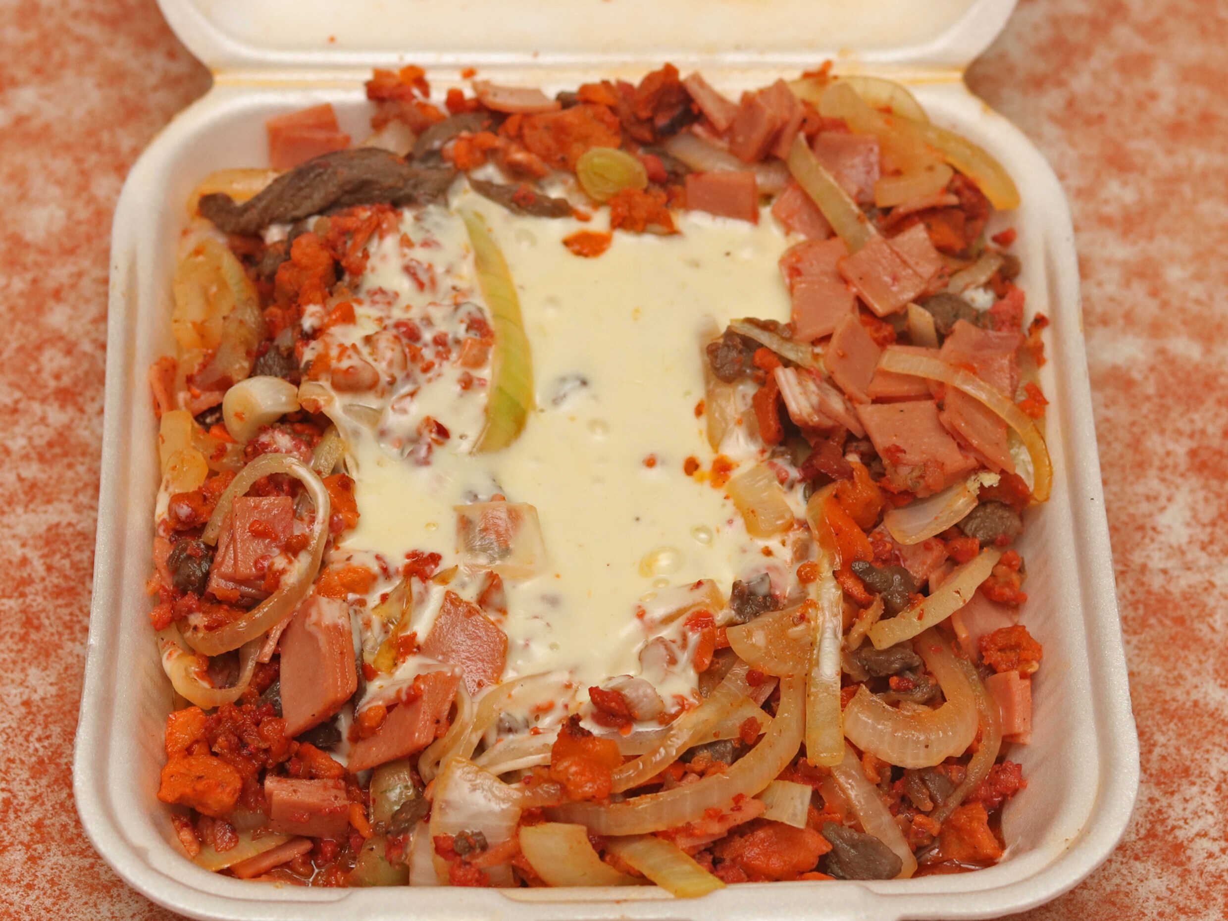 Chuleta, tocino, jamón, chile, pimiento, cebolla, tomate...