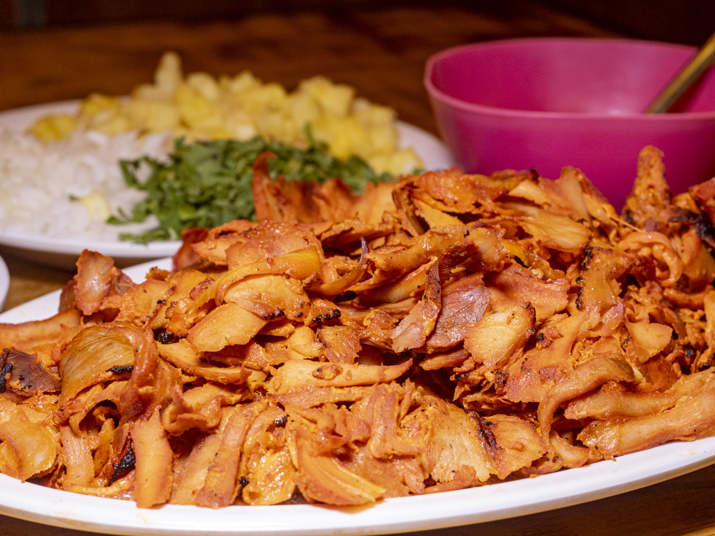 Fajita de pastor, tocino, jamón, pimiento, cebolla y queso
