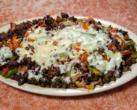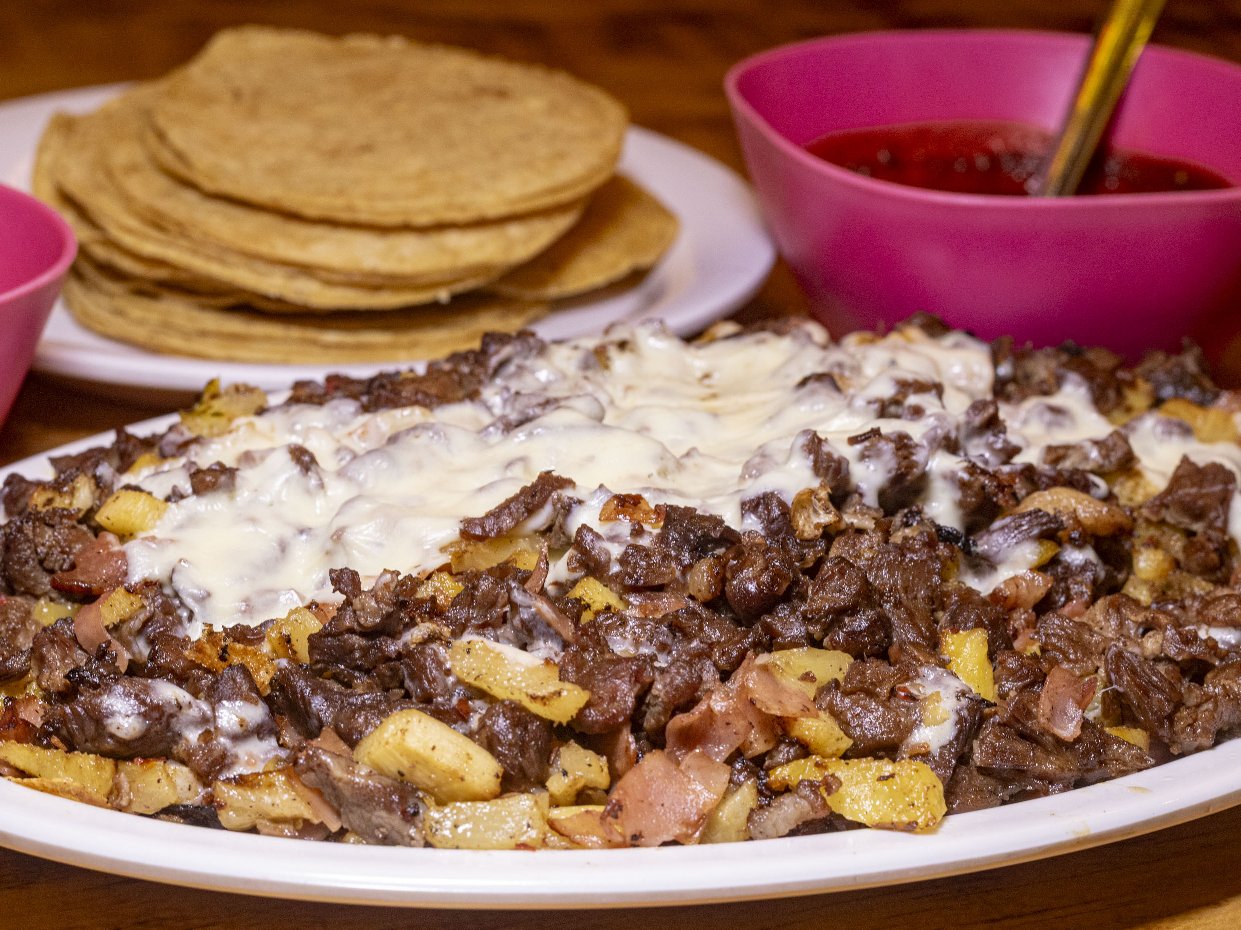 Fajita, tocino, jamón, tomate, chile, pimiento, cebolla y queso.