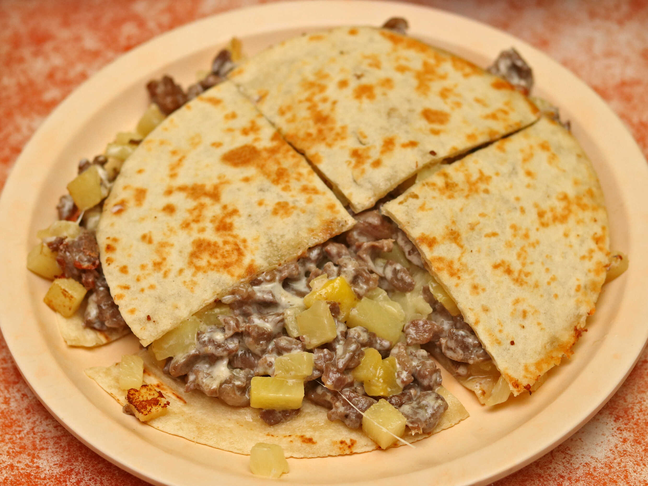 Pastor, piña, queso amarillo, queso asadero, aguacate, mayonesa y BBQ
