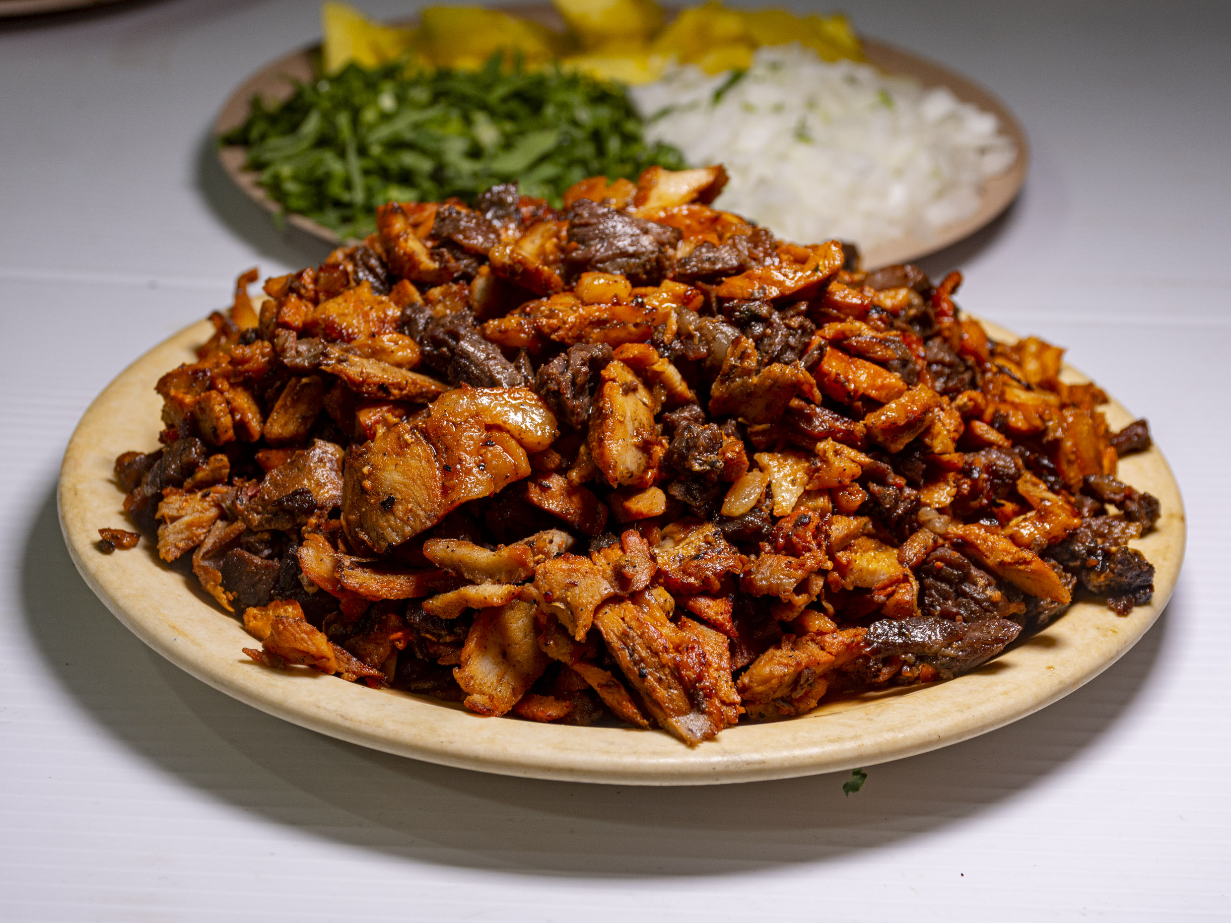 Carne se pesa cruda, acompañado de 15 tortillas, cebolla asada, aguacate, pico de gallo, cebollitas con habanero, limones, salsa roja y verde.