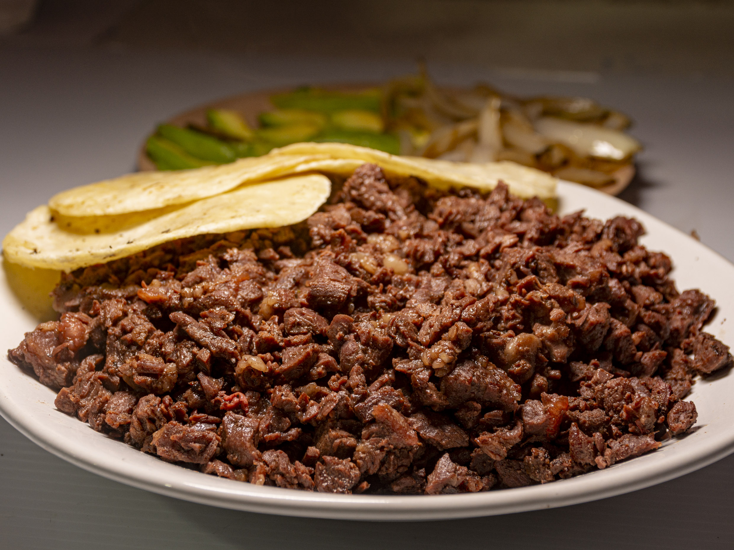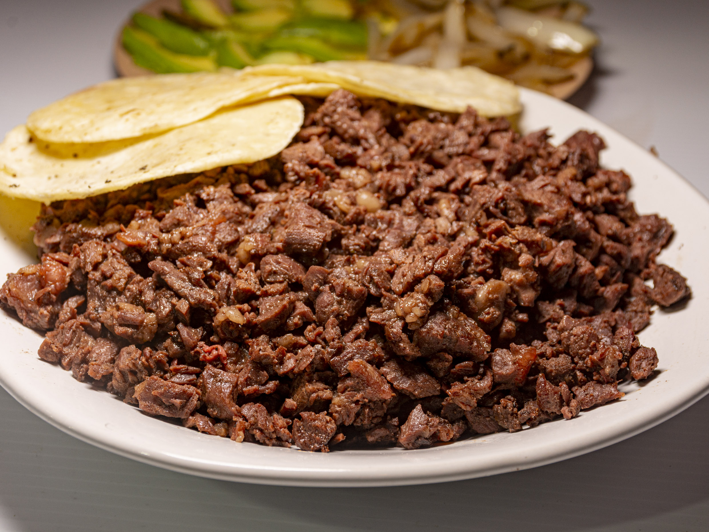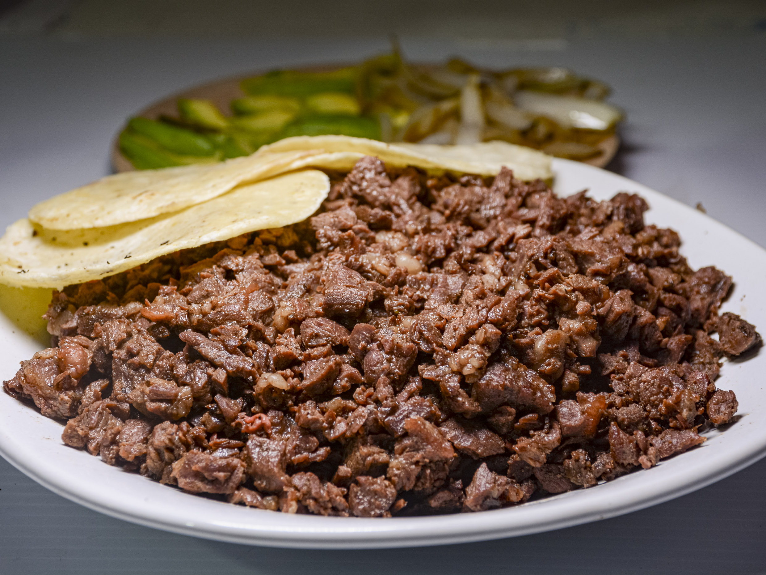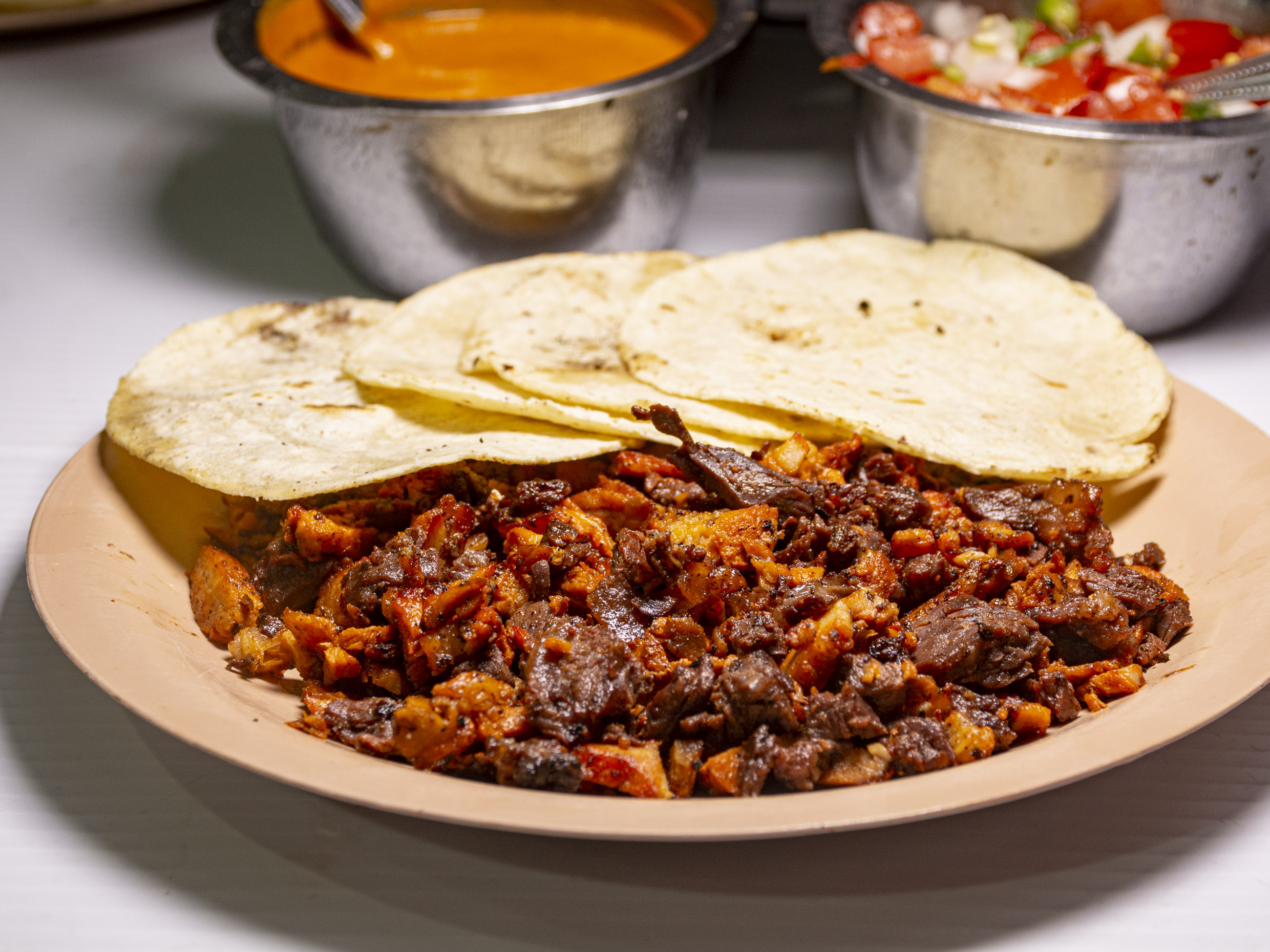 Carne se pesa cruda y se coce revuelta en la plancha, acompañado de 15 tortillas, pico de gallo, cebollitas con habanero, limones, salsa roja, verde y verdura.
