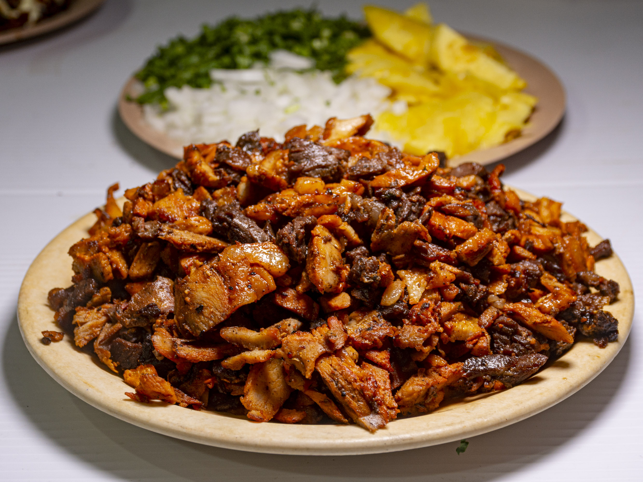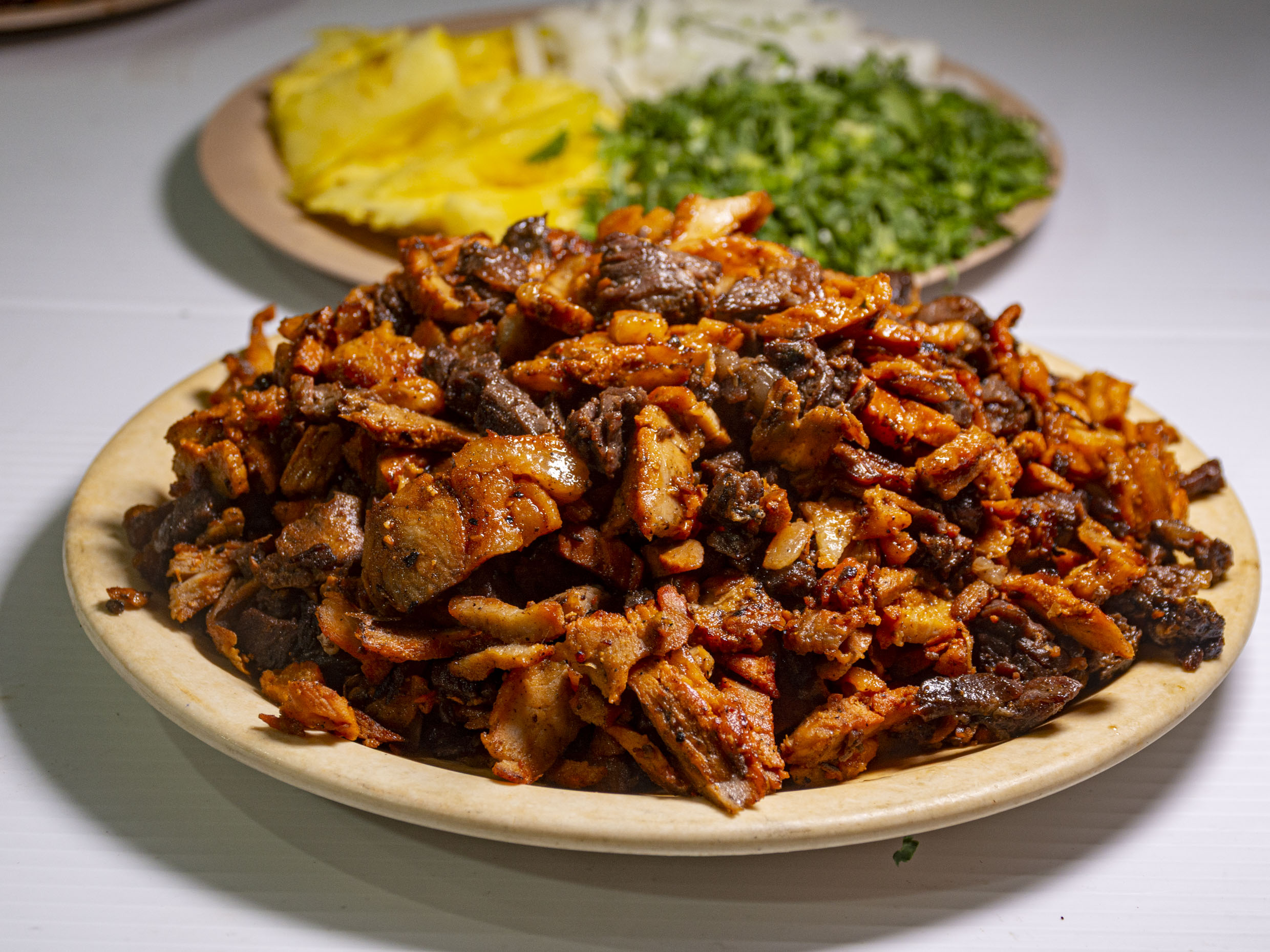 Carne se pesa cruda y se coce en la plancha - revuelto- acompañado de 50 tortillas, piña, cebolla, cilantro, pico de gallo, cebollitas con habanero, limones, salsa roja, verde.