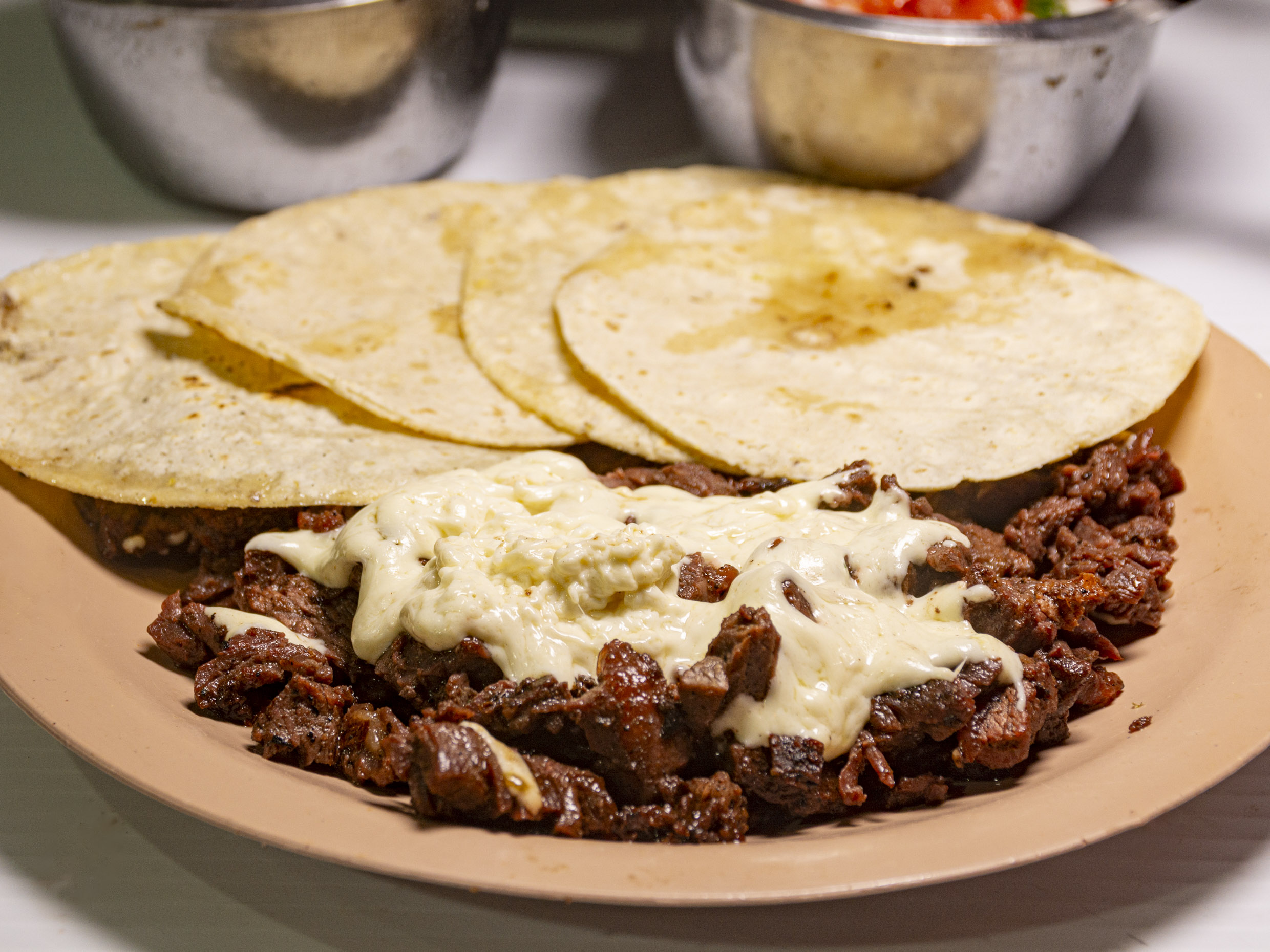 Porción de carne con queso asadero derretido acompañada de 4 tortillas de maíz.