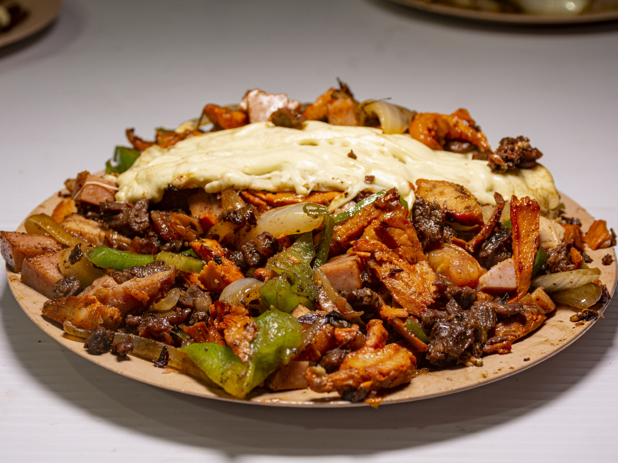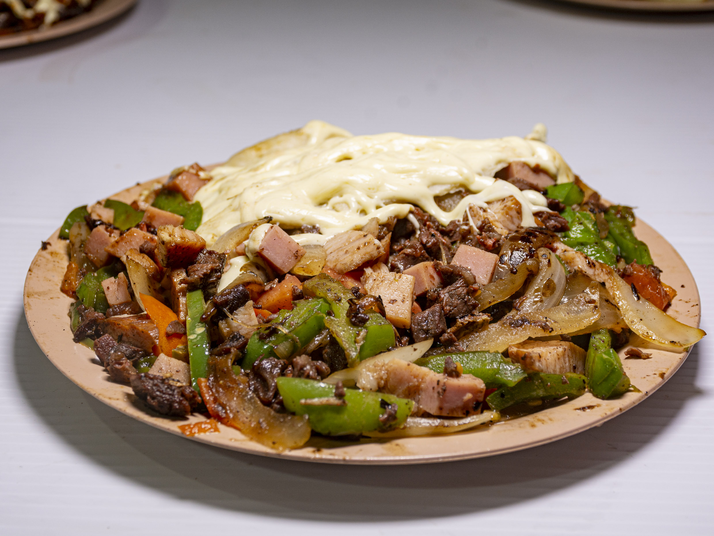 Pastor, fajita, jamón, tocino, cebolla, morrón y queso.