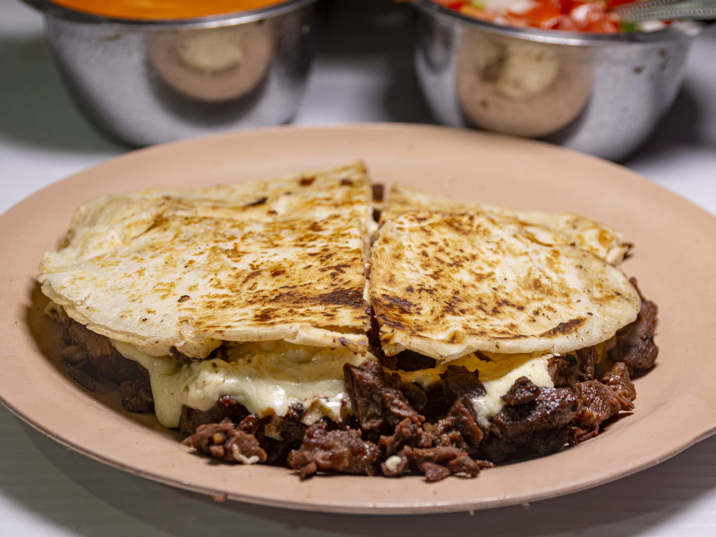 Pastor, fajita, piña y queso asadero en medio de dos tortillas de harina.