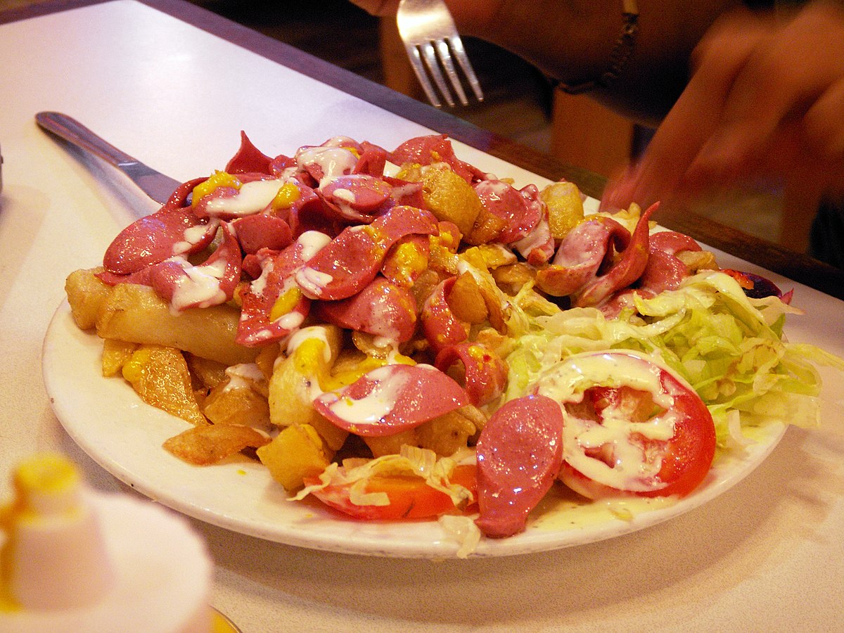 Papas a la francesa con salchicha de pavo en rebanadas, incluye una porción de catsup y mayonesa.