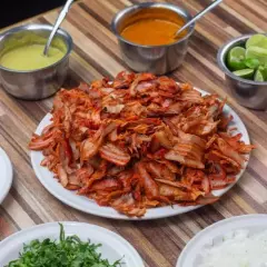 Cebolla asada, aguacate, salsa verde y roja, pico de gallo, cebolla con cilantro, tortillas de maíz y limones.