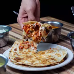 Carne al pastor, arrachera, piña y queso en dos tortillas de harina.