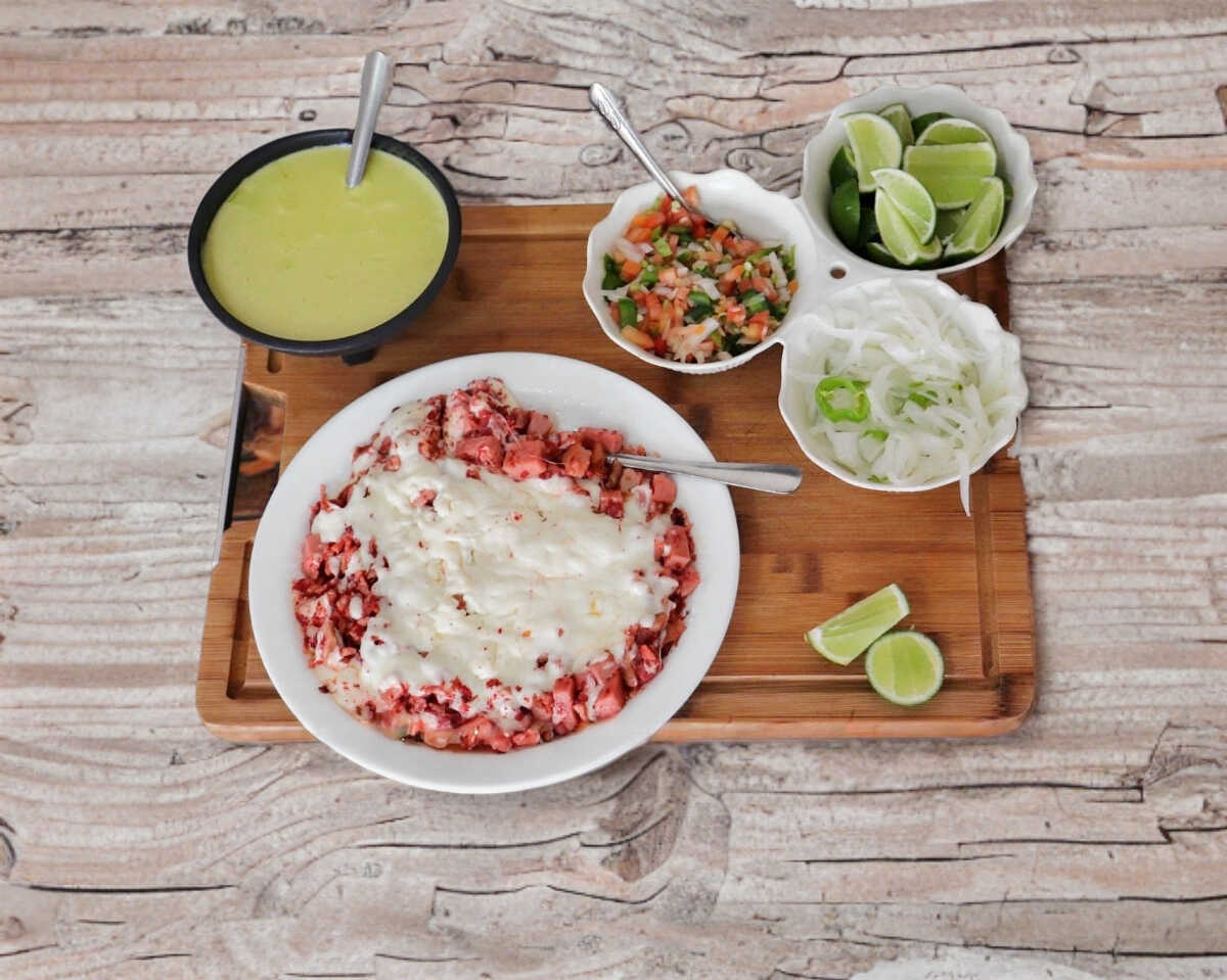 CHULETA, TOCINO, JAMÓN, CHORIZO, CHILE POBLANO, CEBOLLA, JITOMATE, QUESO, 9 TORTILLAS DE HARINA O 25 DE MAÍZ