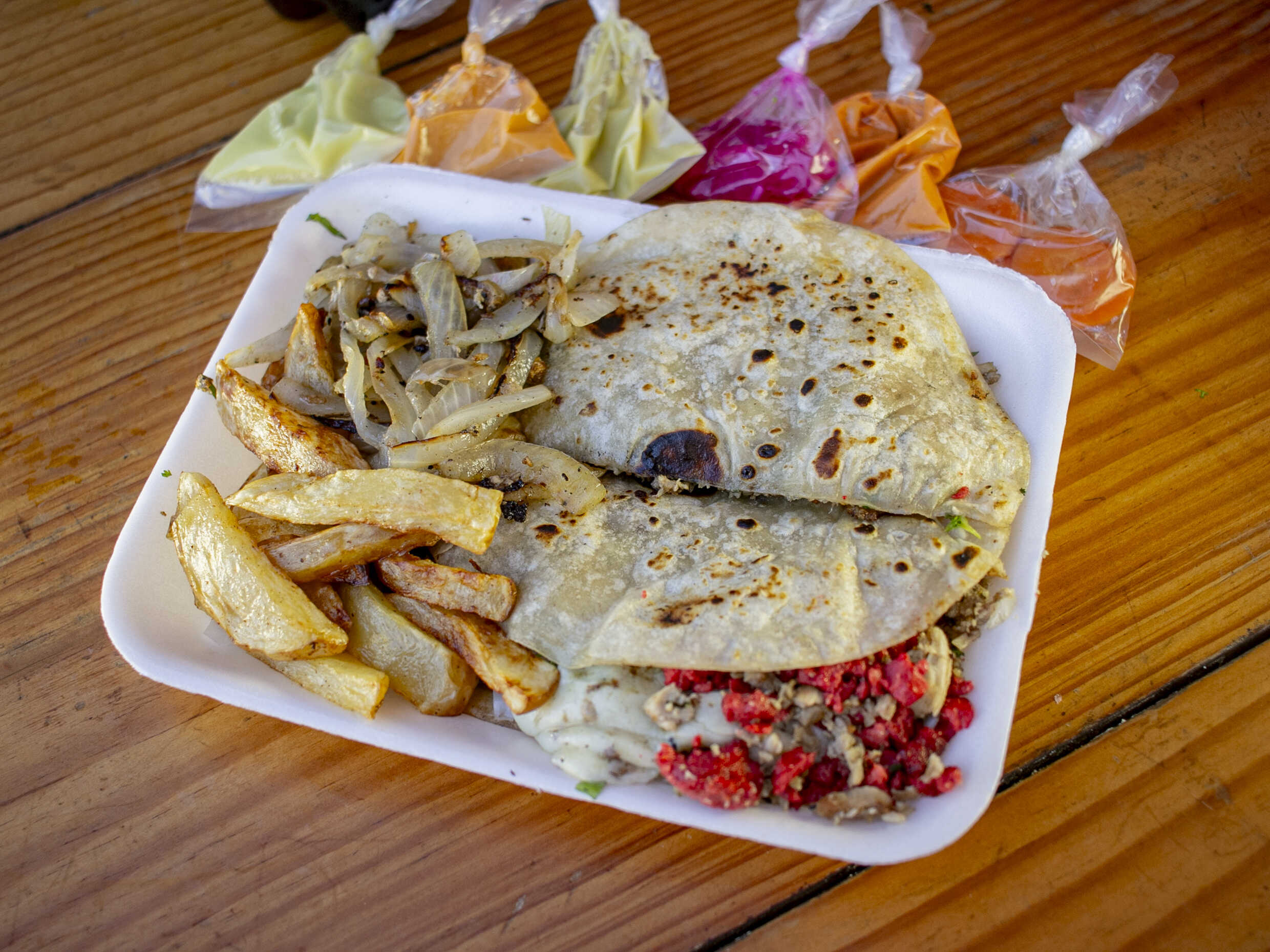 Sin mermas. 50 Tortillas, acompañado de cebolla, cilantro, crema, limones, zanahorias, cebolla asada, cebolla morada con habanero, salsa verde, salsa de cacahuate y salsa de aguacate no picosa.