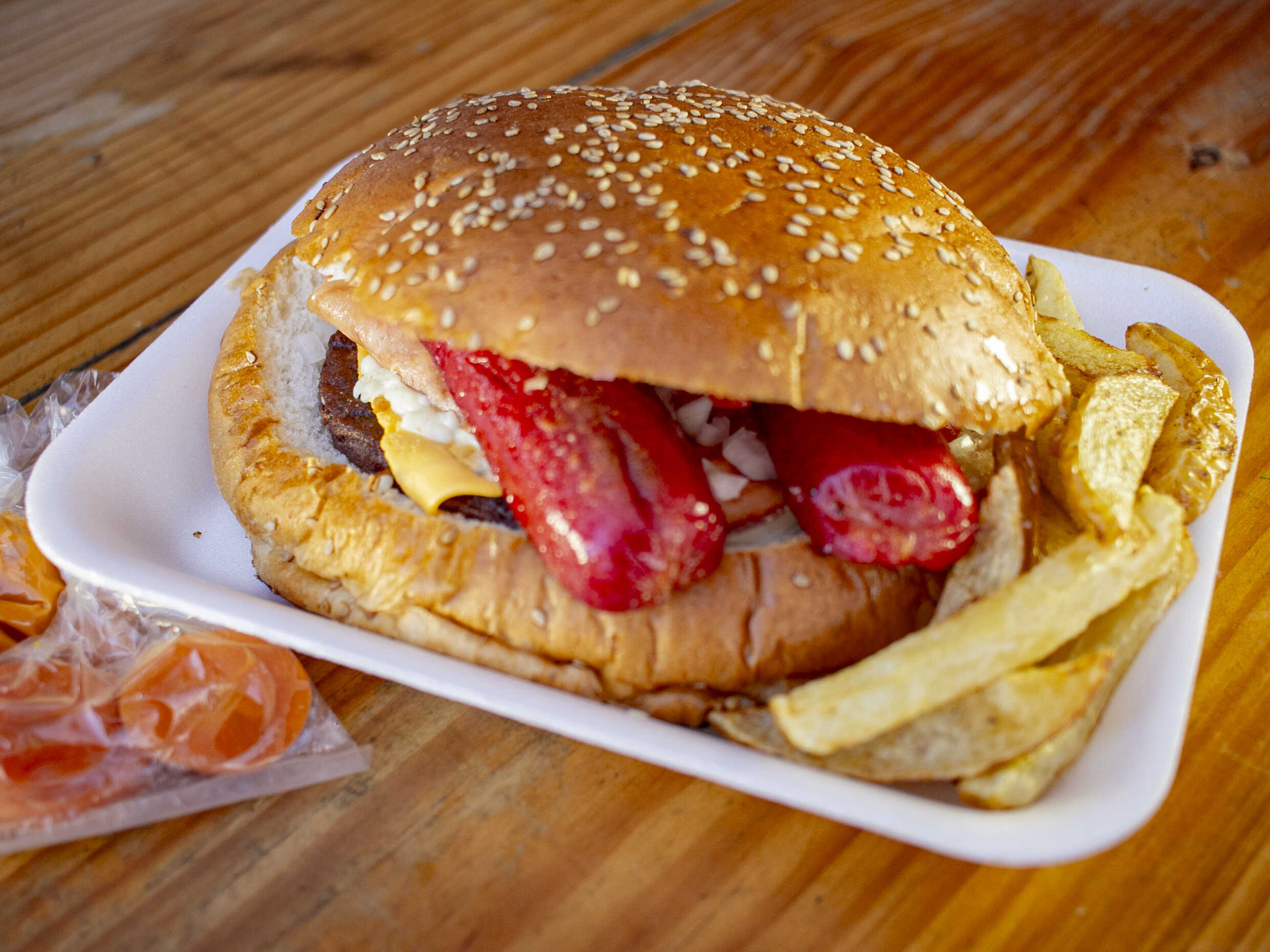 Hamburguesa Gigante choriqueso ,hawaiana con salch
