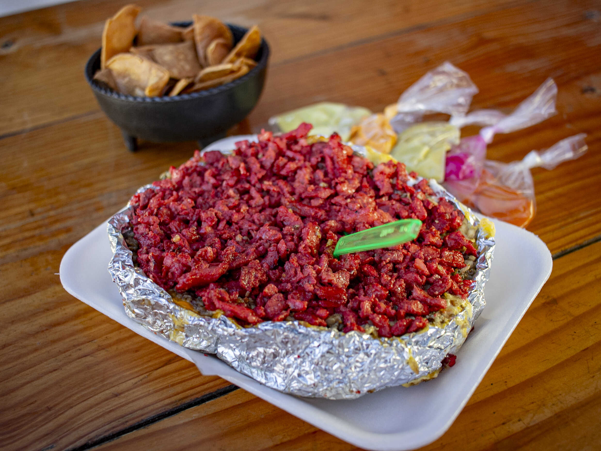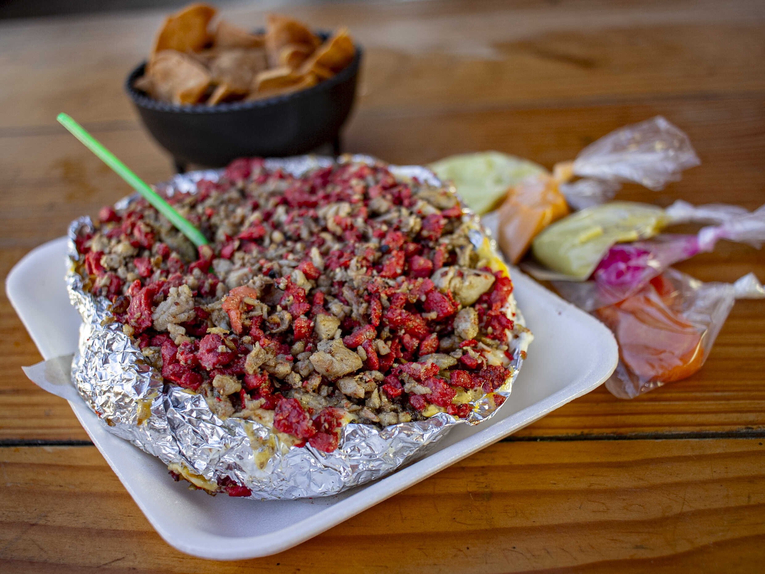 incluye: zanahorias , limones, cebolla morada con habanero, salsa verde, salsa de cacahuate y salsa de cacahuate (no picosa)