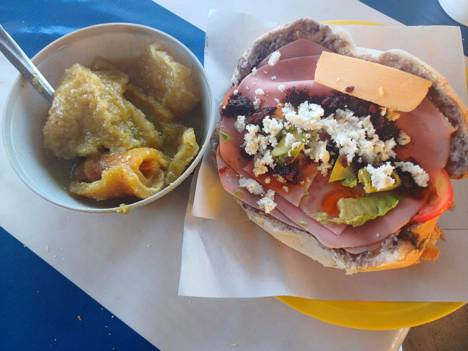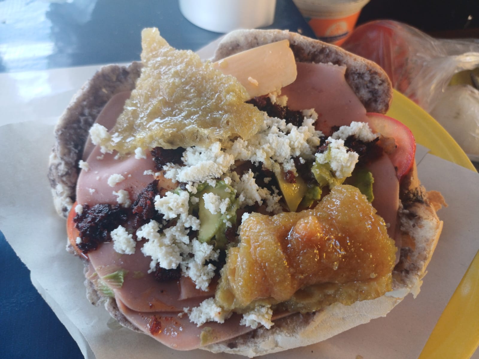 Torta en pan frances con frijoles, el doble de los ingredientes, chorizo, jamón, queso de puerco, aguacate, queso amarillo, queso blanco, cebolla, tomate y una picosa salsa verde de chicharrón.