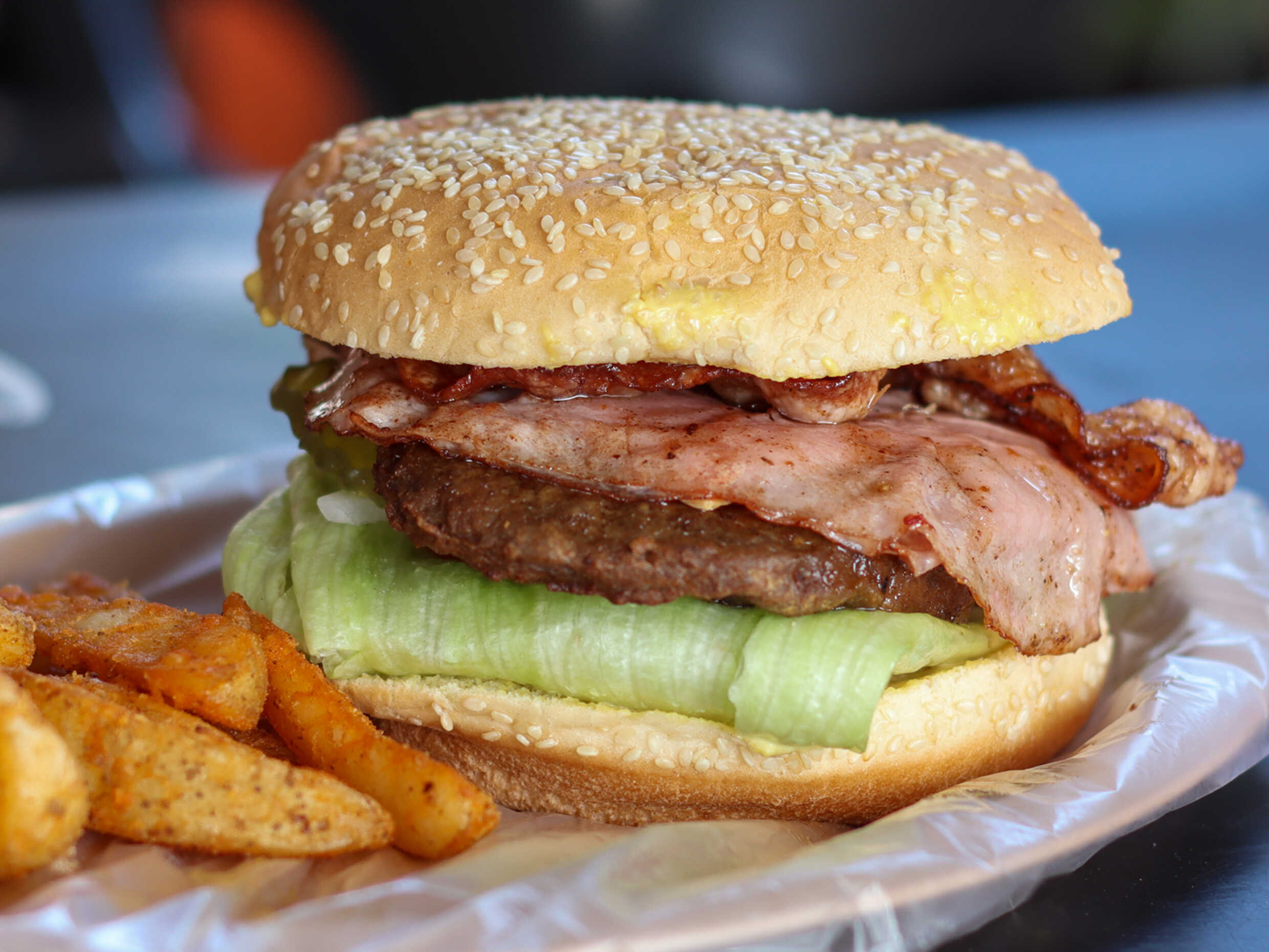 Pan, aderezo casero, carne sirlon, queso amarillo, 2 rebanadas de jamón, 4 tiras de tocino, lechuga, tomate, cebolla, pepinillos, cátsup, zanahoria, chiles en vinagre y papas sazonadas.