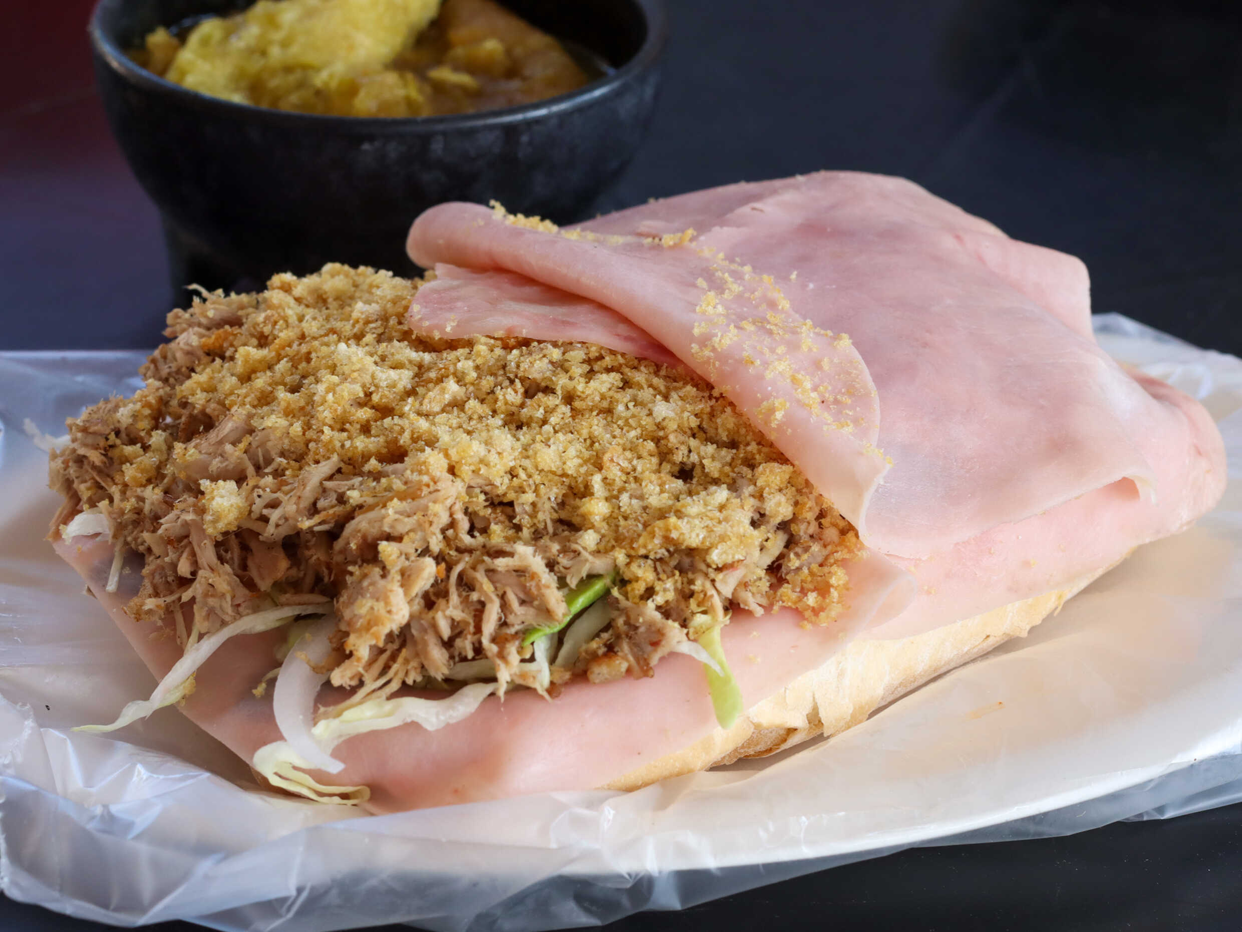 Pan francés, aderezo casero, 2 rebanadas de jamón, queso amarillo, tomate, cebolla, aguacate, carne deshebrada, chicharrón desboronado y jamón.