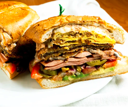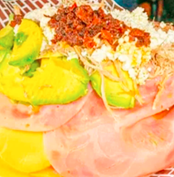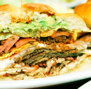 Pan de la casa con combinada de pierna y deshebrada, mayonesa, cebolla, aguacate y tomate.